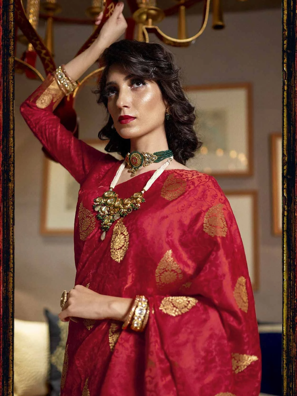 Charm at hearts donning in this red color festive saree crafted in satin. Decked up with zari woven jacquard patterns all over, showcasing distinstive pallu with thread tassels. Comes with a matching red color blouse in satin. Please keep in mind that the accessories featured are purely for fashion purposes. Due to photography reasons, some color variations may occur. The un-stitched blouse may be customized up to 42 inches.
