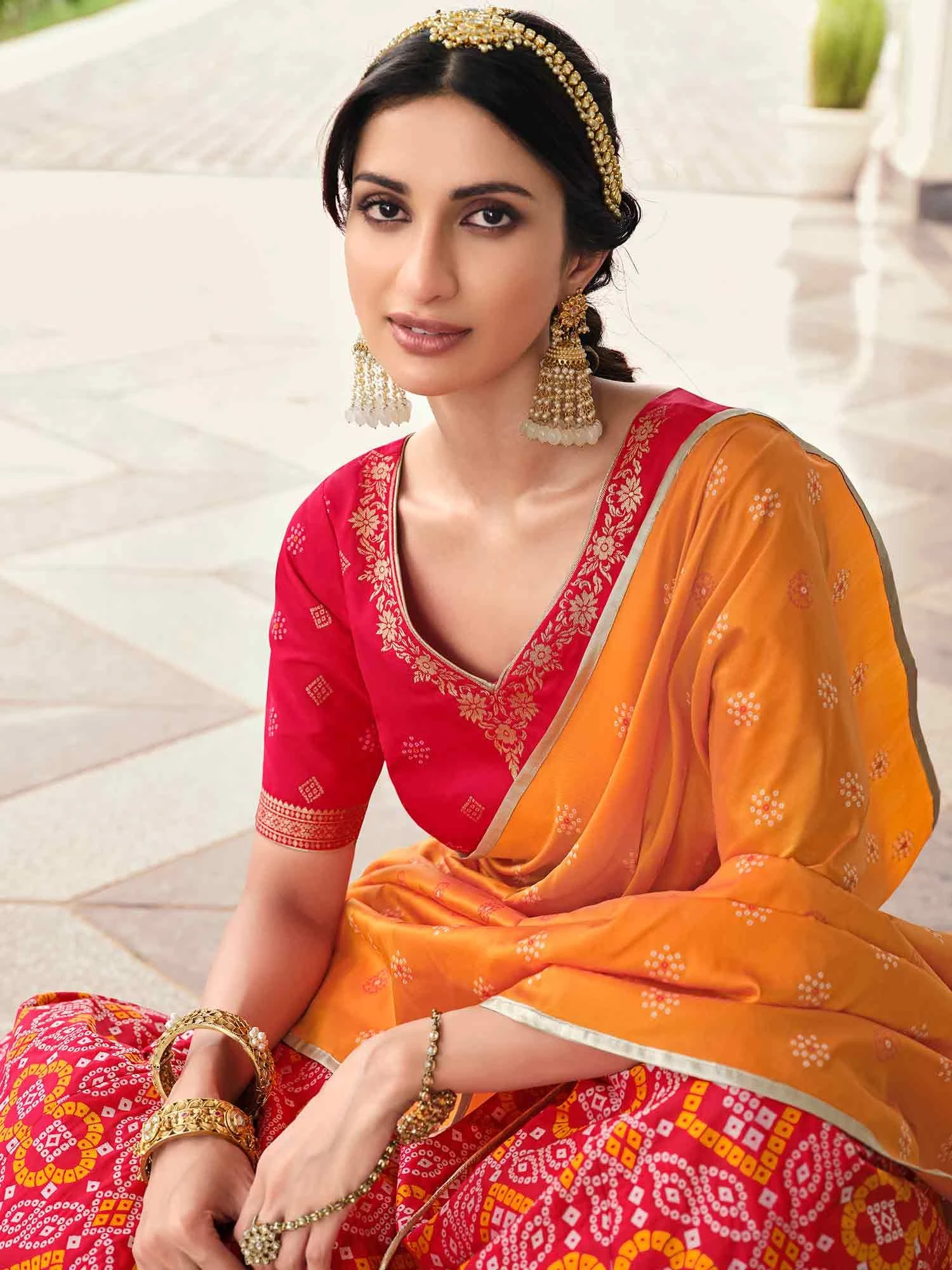 Glam up sweetly adorning this red color lehenga in banarasi silk. Furnished with traditional zari woven patterns. Available with matching red color banarasi silk choli and yellow dupatta with similar weaves. Note: The accessories featured are purely for fashion purposes. Due to photography reasons, some color variations may occur. The semi-stitched choli and lehenga waist may be customized up to 42 inches.
