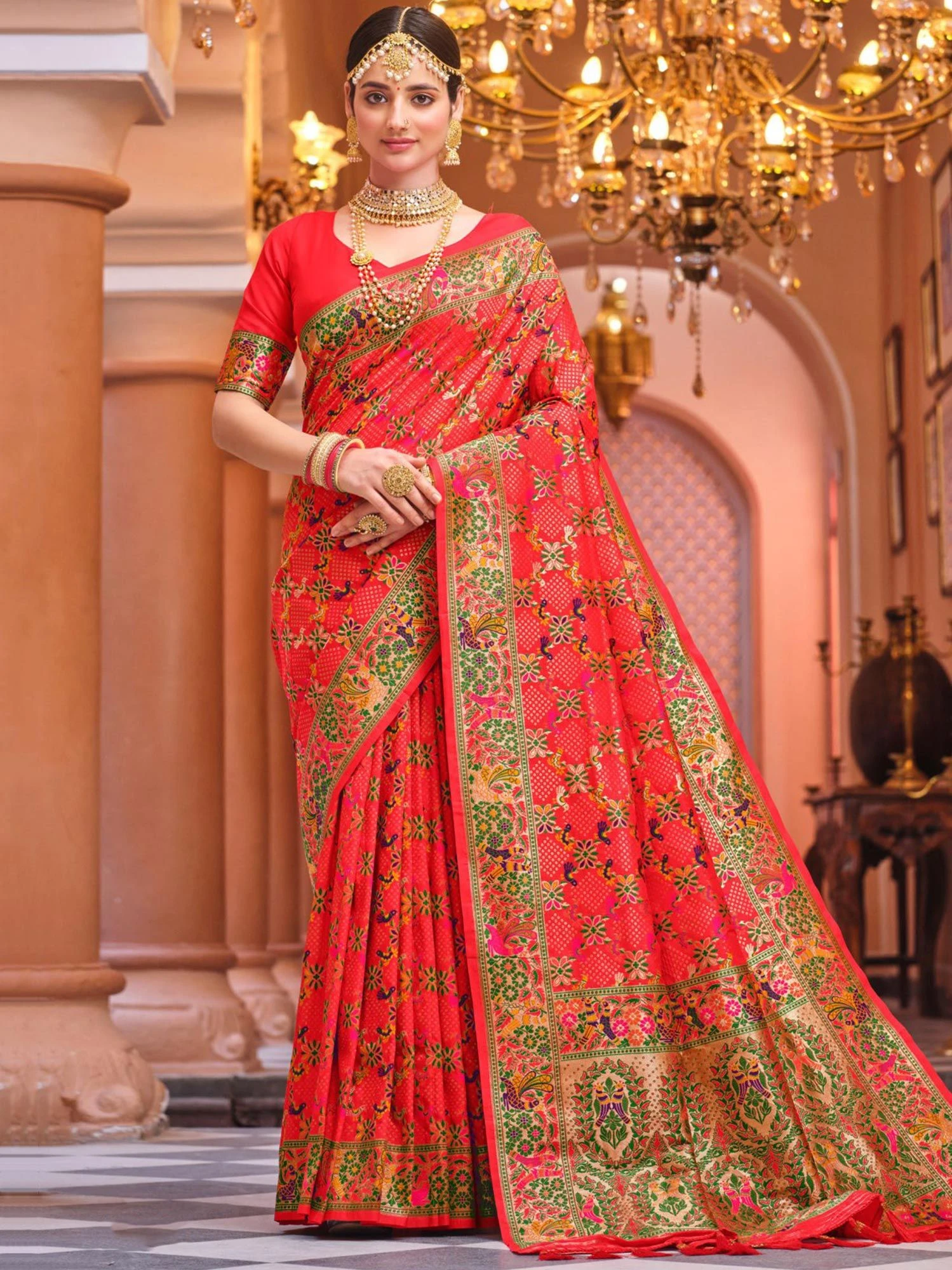Grab all the attention as you wear this tomato red color saree crafted in banarasi silk. Decorated using zari woven patterns, showcasing distinstive borders and pallu. Paired with a matching red color blouse in banarasi silk. Note: The accessories featured are purely for fashion purposes. Due to photography reasons, some color variations may occur. The un-stitched blouse may be customized up to 42 inches.