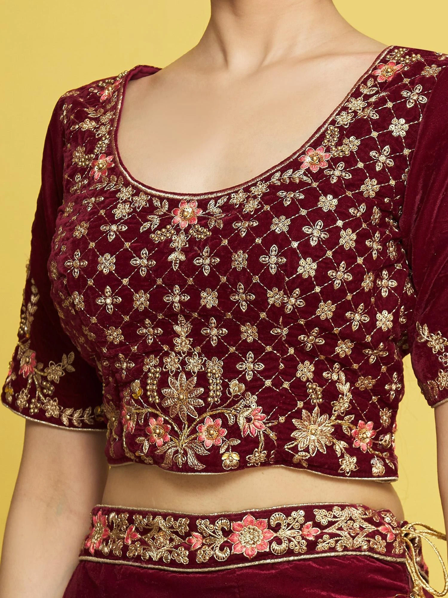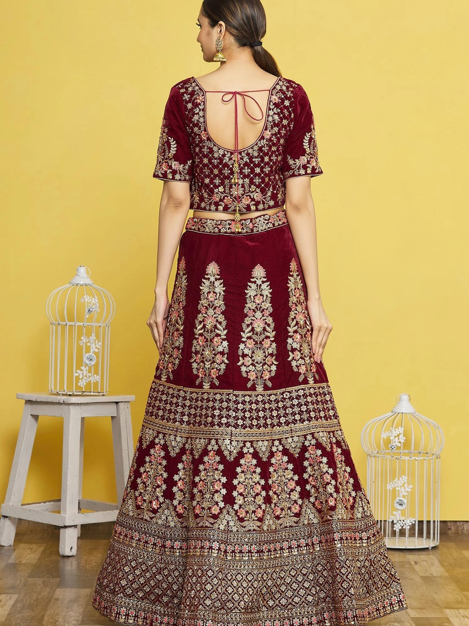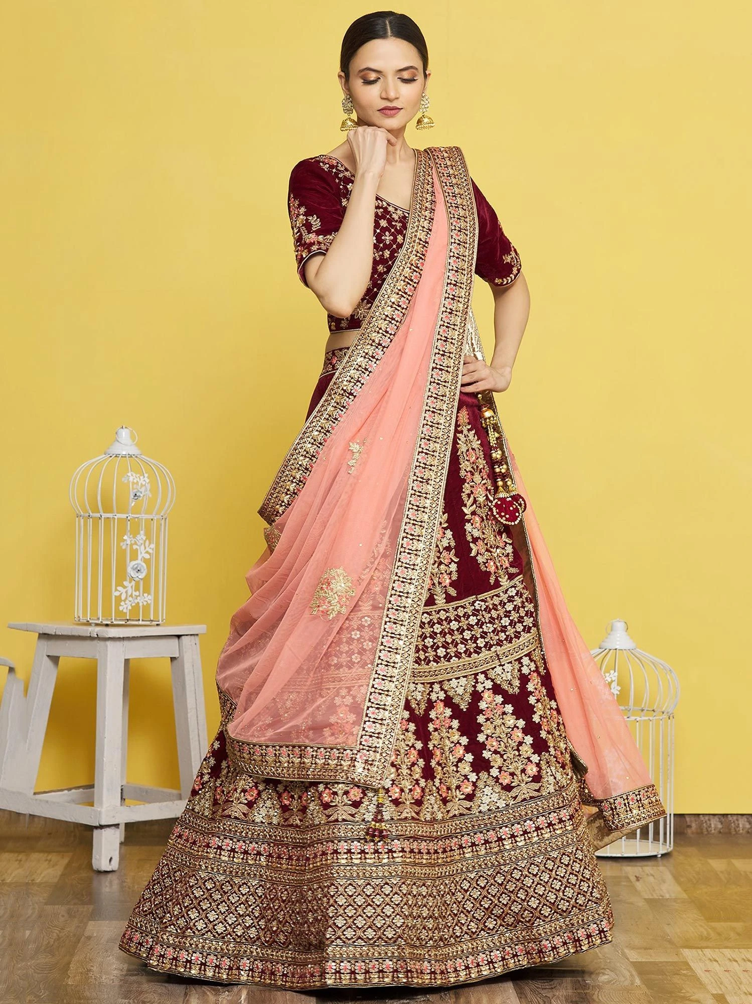 Walk the glam wearing this deep red color A-line lehenga in velvet. Augmented with sequins, zari and thread embroidered work all over. Teamed with a matching red color embroidered choli in velvet and a peach laced dupatta in organza. Note: The accessories featured are purely for fashion purposes. Due to photography reasons, some color variations may occur. The semi-stitched choli and lehenga waist may be customized up to 42 inches.