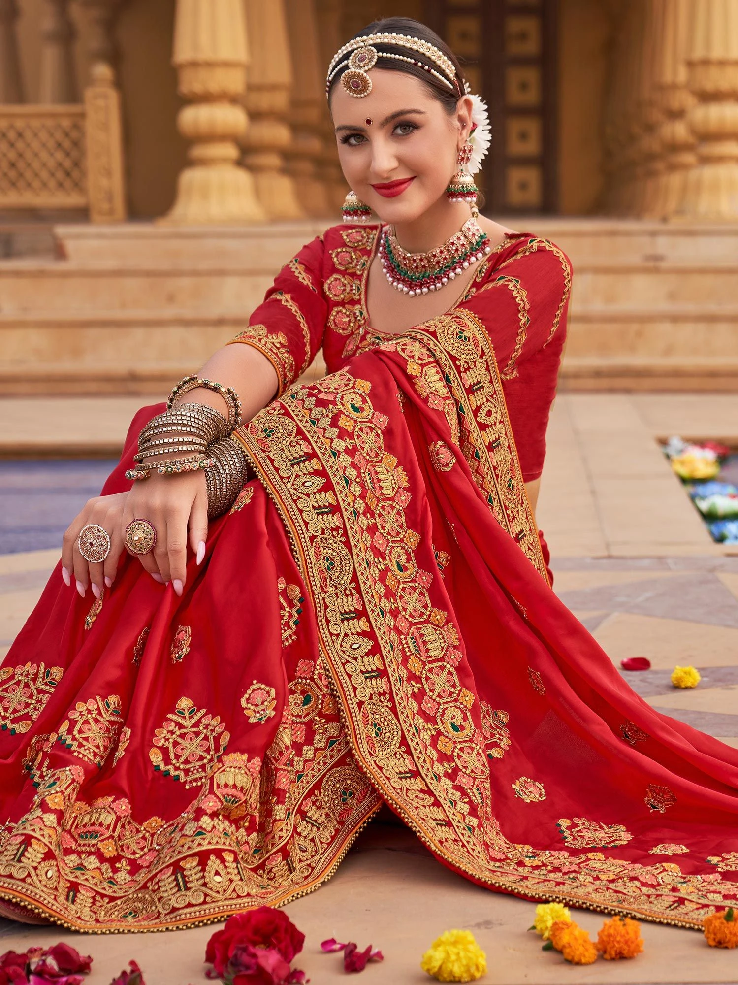 Evoke the desi diva in you wearing this bright red color bridal saree made in art silk. Enhanced using zari, thread work embroidery with stone embellishments showcasing distinstive borders. Comes with a matching red color embroidere blouse in dupion silk. Note: The accessories featured are purely for fashion purposes. Due to photography reasons, some color variations may occur. The un-stitched blouse may be customized up to 42 inches.