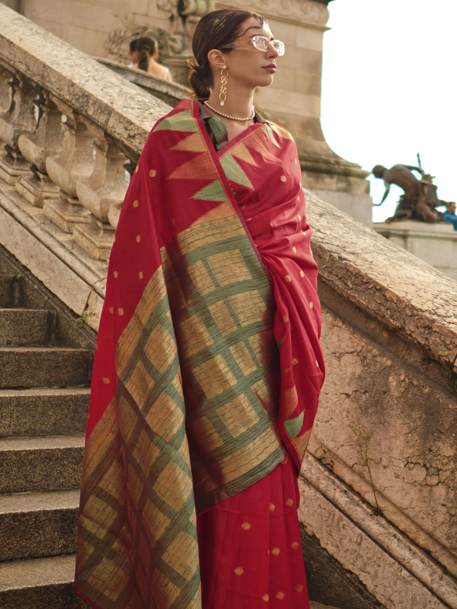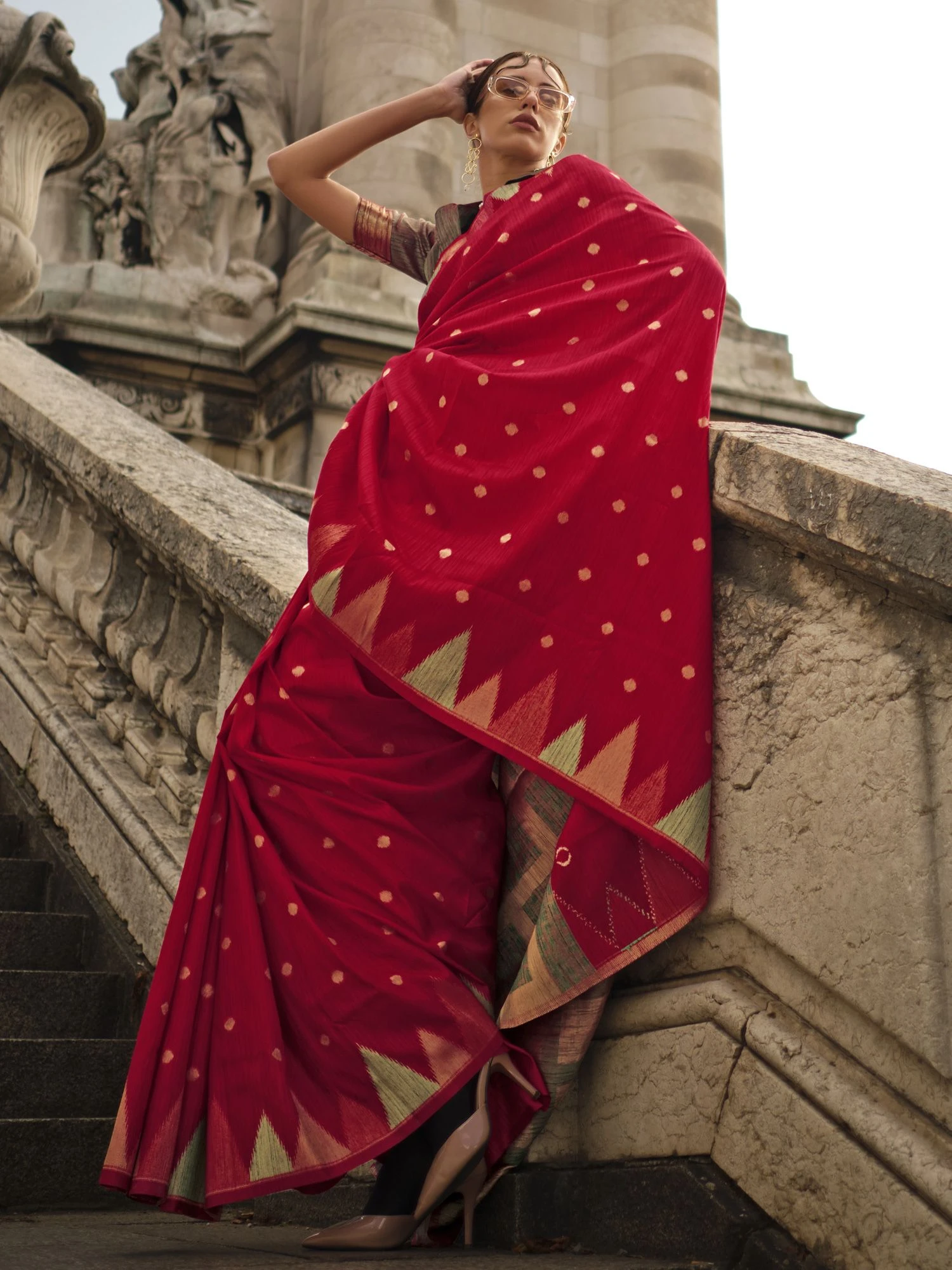 Radiate easy elegance as you wear adorning this ruby red color saree crafted in khadi silk. Furnished using woven patterns, showcasing distinstive borders and pallu. Comes with a matching grey color blouse in khadi silk. Note: The accessories featured are purely for fashion purposes. Due to photography reasons, some color variations may occur. The un-stitched blouse may be customized up to 42 inches.