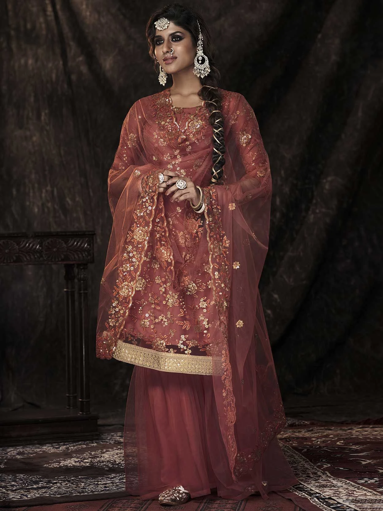 An fantastic Rust Colour Net Fabric Unstitched Salwar Kameez will make you appear quite stylish and graceful. The lovely Sequin Work work a substantial attribute of this attire.