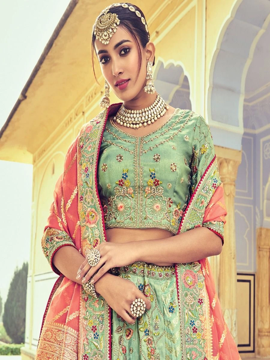 Stealing the spotlight and hearts of everyone having this sage green color designer lehenga in banarasi silk. Elevated with sequins, stone and zari weaving with thread work embroidered work. Comes with a matching sage green color embroidered choli in raw silk and peach color dupatta, made in banarasi silk. Note: The accessories featured are purely for fashion purposes. Due to photography reasons, some color variations may occur. The semi-stitched choli and lehenga waist may be customized up to 42 inches.