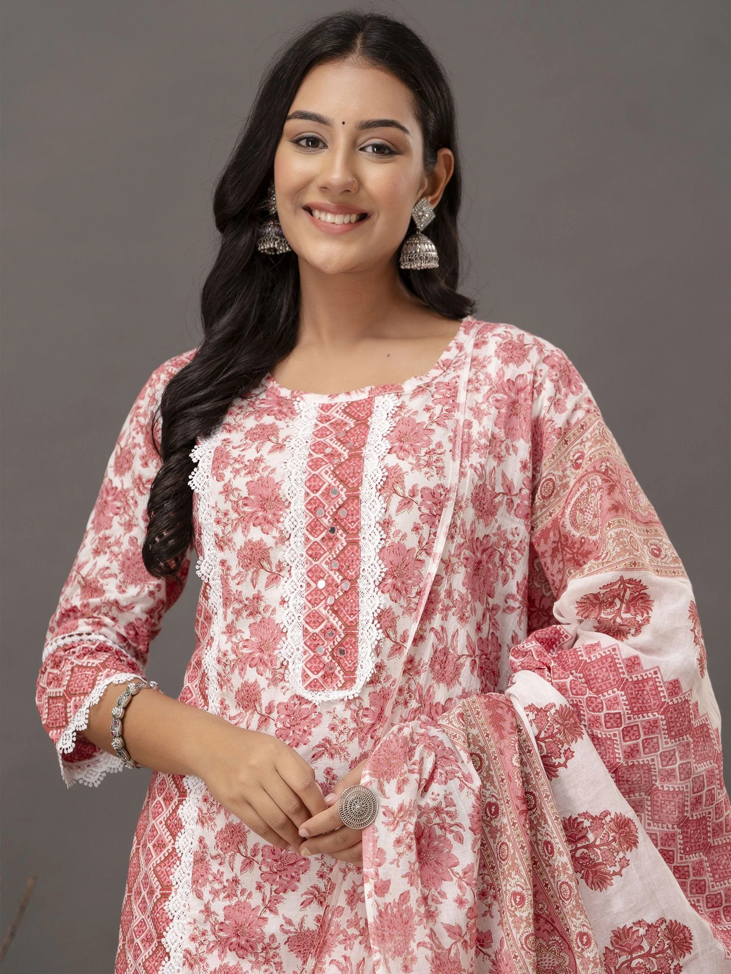 Glam up the views with this salmon pink color straight cut kameez in cotton. Enhanced using mirror and floral printed pattern all over. Assigned with a cotton dupatta and a pant style bottom, both made in pink color. Note: Accessories shown are for styling purpose only. Slight color variation may occur due to photographic reasons. The semi-stitched kameez can be customised upto 42 inches.