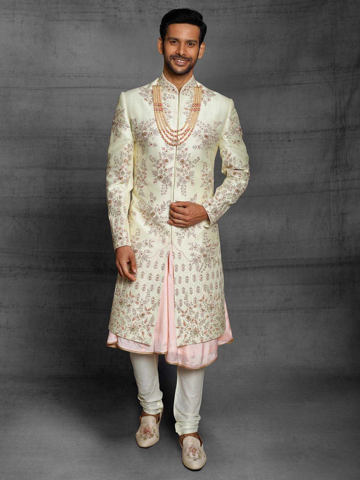 Antique Look Cream,Peach Colour Silk Fabric Men’s Sherwani With Matching Anarkali Kurta With Churidar Pajama With Thread,Hand Work