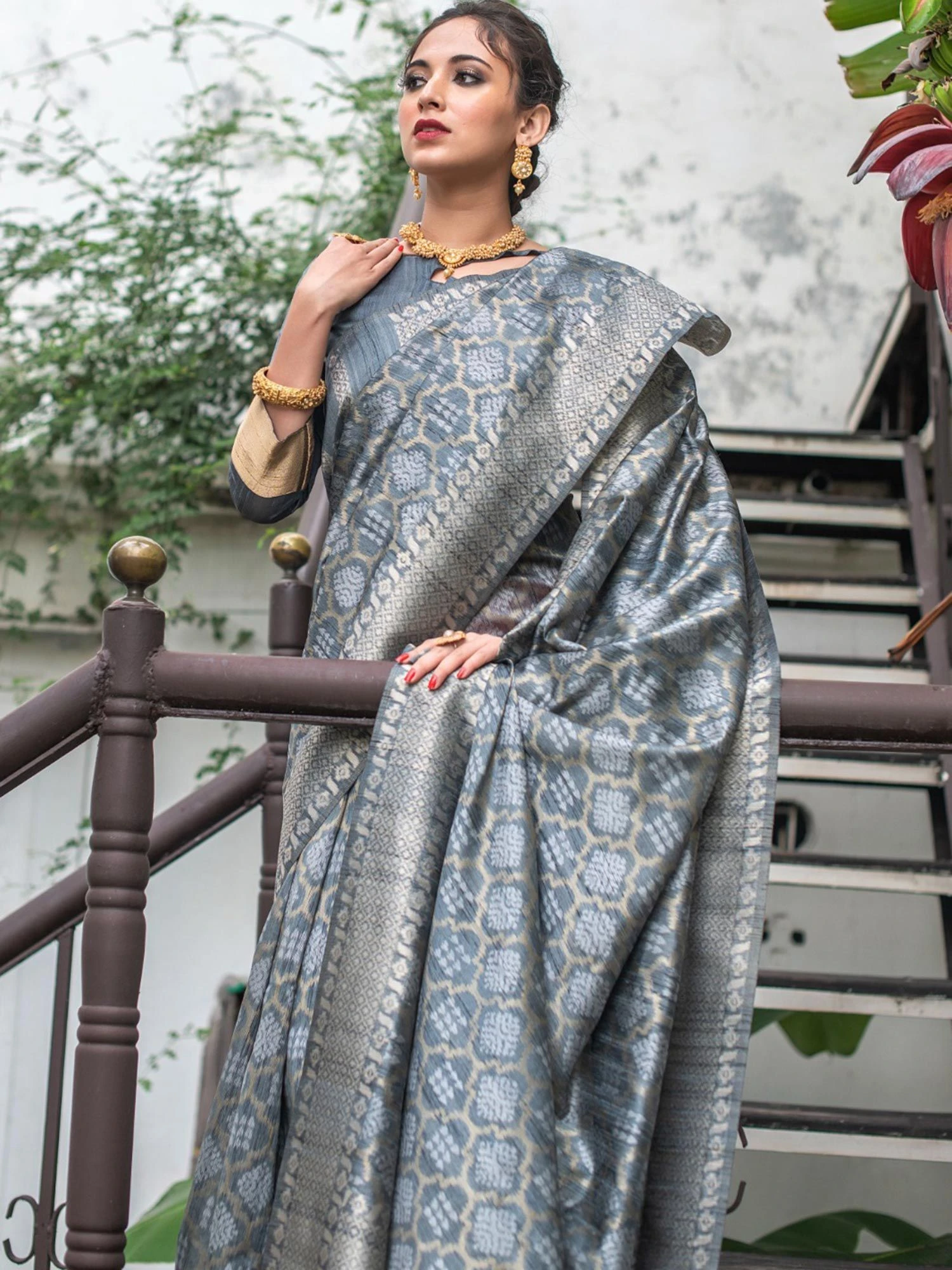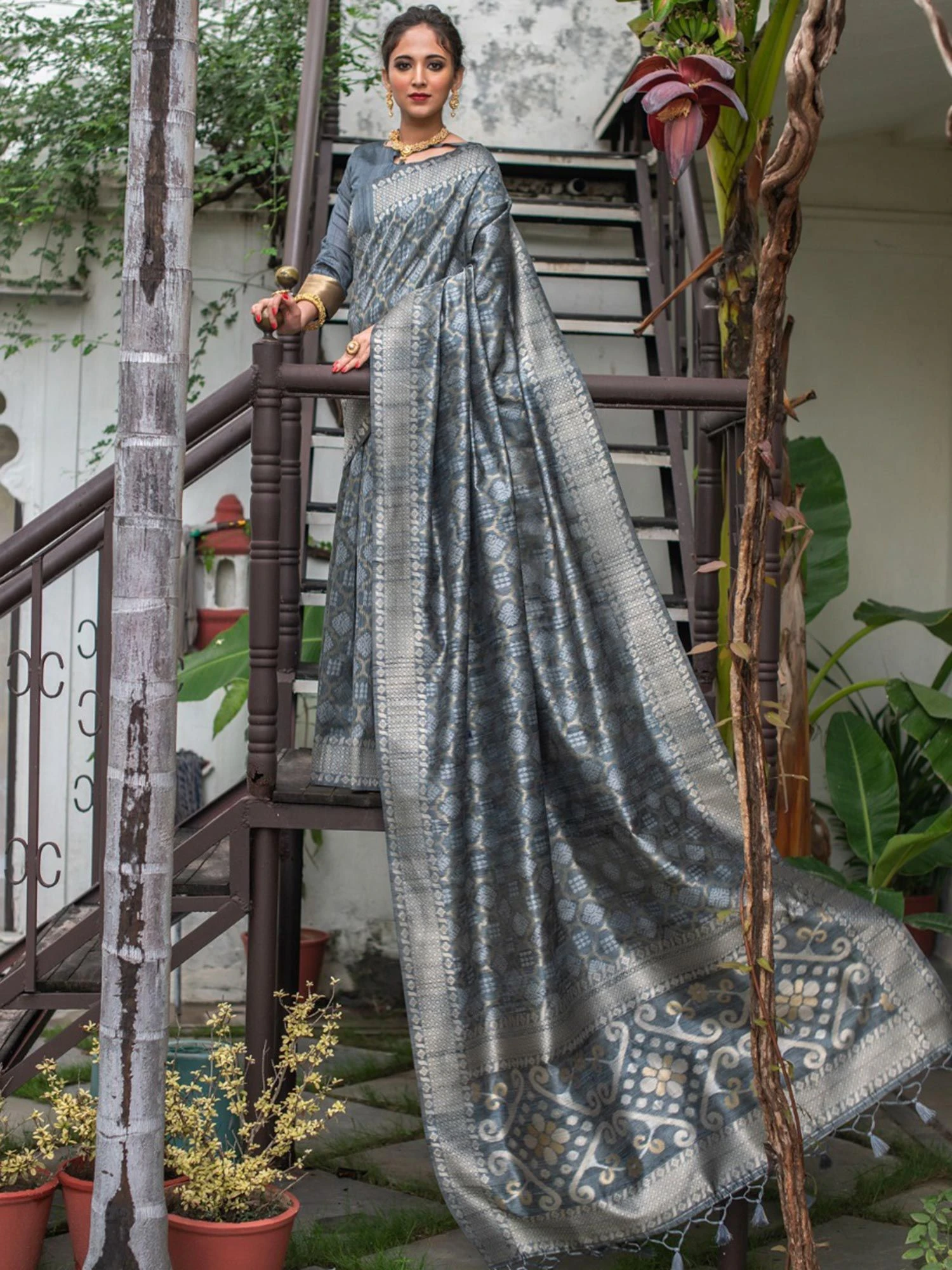 Steal the show as you wear this silver color saree crafted in tussar silk. Decorated using zari woven patterns all over with tasseled pallu edge. Teamed with a matching silver color blouse in tussar silk. Note: The accessories featured are purely for fashion purposes. Due to photography reasons, some color variations may occur. The un-stitched blouse may be customized up to 42 inches.