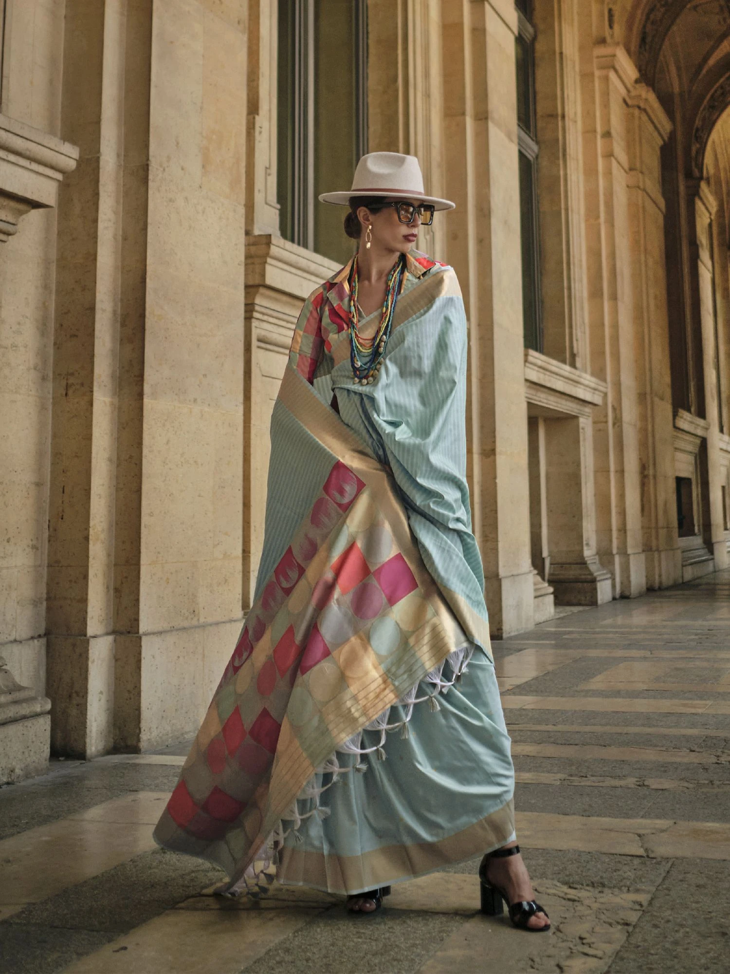 Evoke the diva in you wearing this sky blue color saree crafted in silk. Enhanced using woven patterns, showcasing distinstive borders and pallu. Comes with a matching multicolor blouse in silk. Note: The accessories featured are purely for fashion purposes. Due to photography reasons, some color variations may occur. The un-stitched blouse may be customized up to 42 inches.