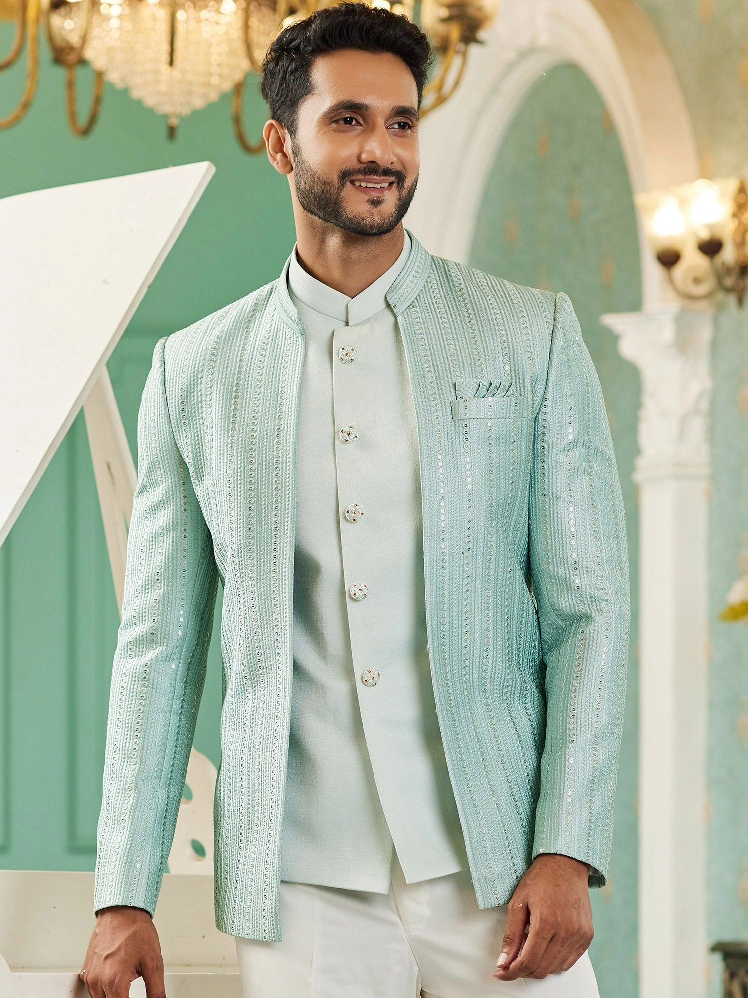 Look no less than a dream wearing this baby blue color jodhpuri suit made in silk. Topped with a embroidered jacket in silk. Paired with a matching white pant in silk. Note: Some color variations may occur owing to photography causes. Up to 1 inch of measurement fluctuation is possible.