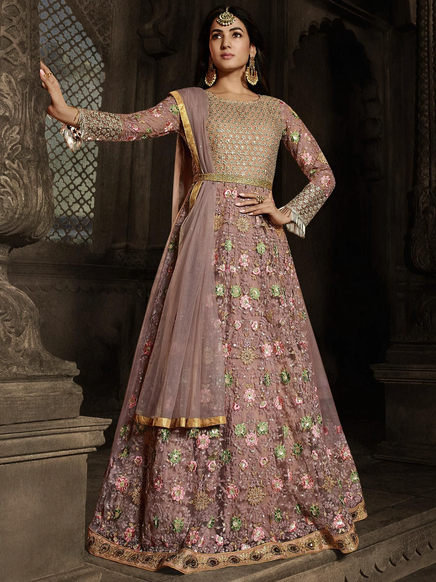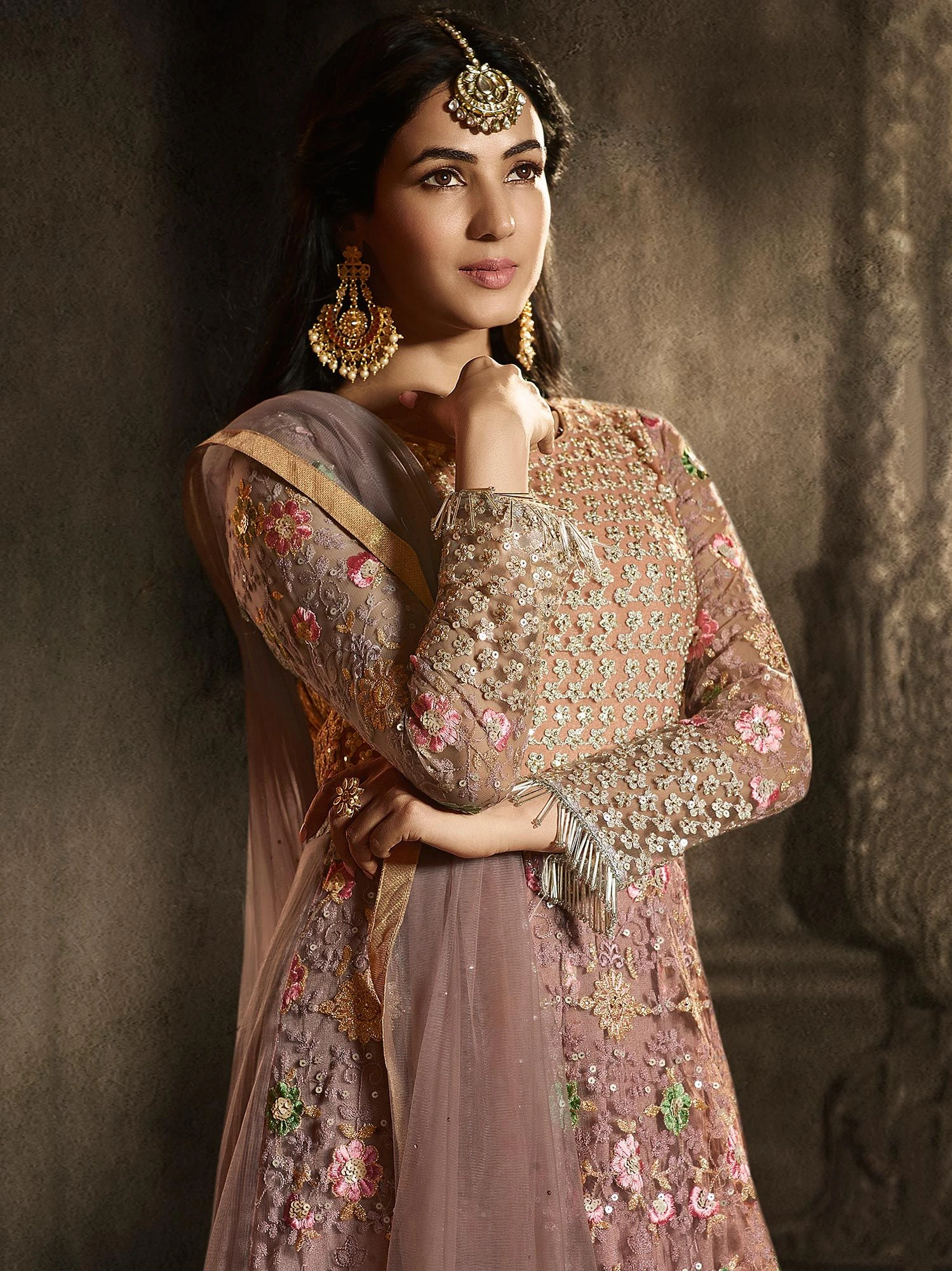 Mark the upcoming celebrations wearing this soft beige color anarkali kameez in net. Enhanced using sequins and thread work embroidery all over. Teamed with a matching net dupatta and a matching bottom in shantoon. Note: Accessories shown are for styling purpose only. Slight color variation may occur due to photographic reasons. The semi-stitched kameez can be customised upto 42 inches.