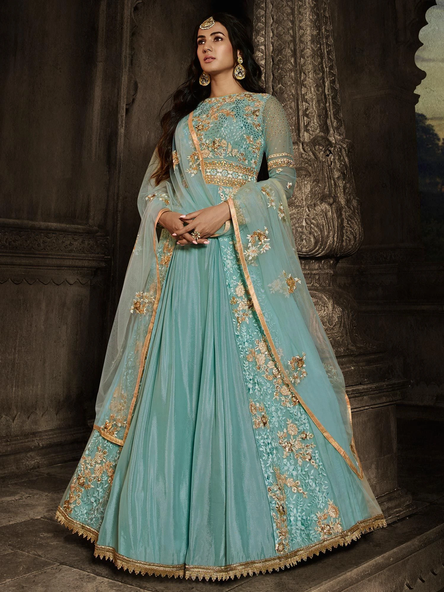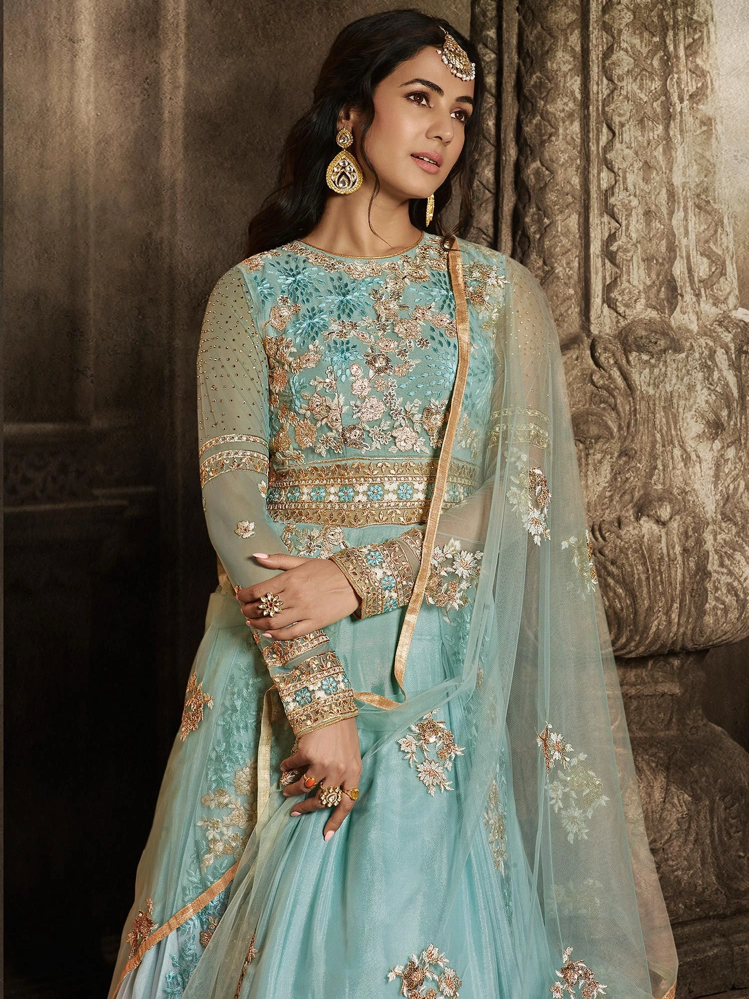 Make a stately statement adorning this sky blue color anarkali kameez in net and georgette. Elevated using sequins and thread work embroidery all over. Assembled with a matching net dupatta and a matching bottom in shantoon. Note: Accessories shown are for styling purpose only. Slight color variation may occur due to photographic reasons. The semi-stitched kameez can be customised upto 42 inches.