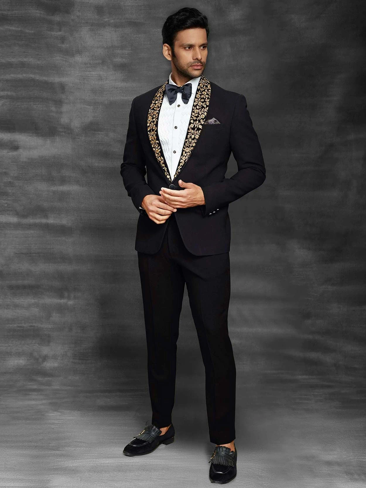 Auspicious Black Colour Imported Fabric Designer Tuxedo Wedding Suit.