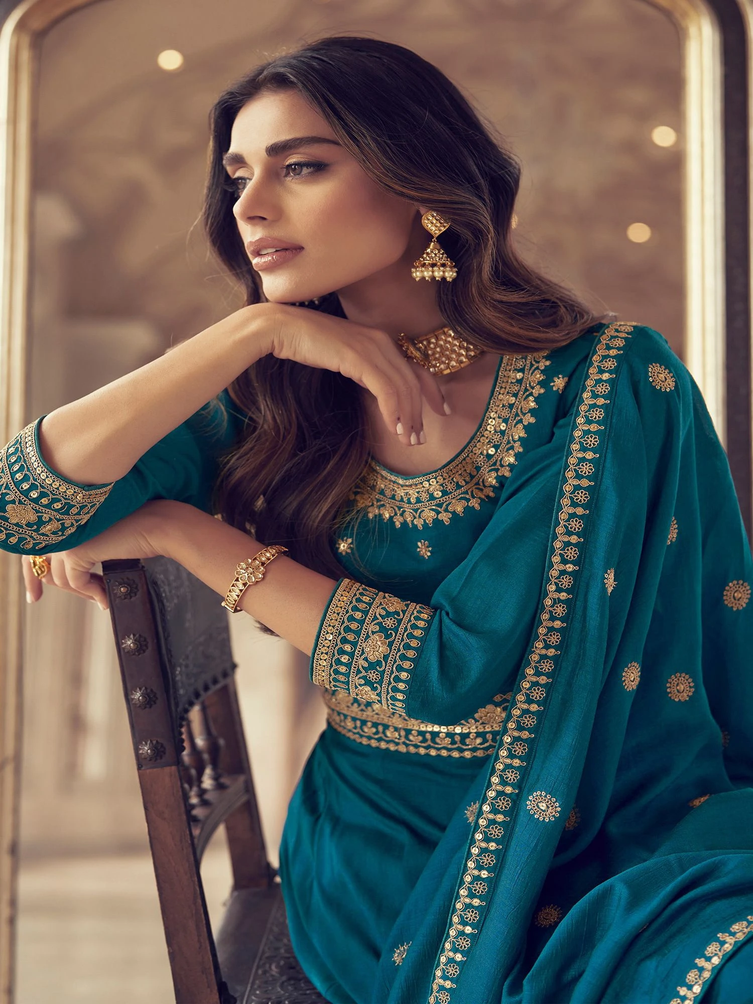 Cherish Your look with this teal blue color anarkali kameez in silk. Augmented using sequins and zari work embroidery all over. Assigned with a silk dupatta and a bottom, both made in teal blue. Note: Accessories shown are for styling purpose only. Slight color variation may occur due to photographic reasons. The semi-stitched kameez can be customised upto 42 inches.
