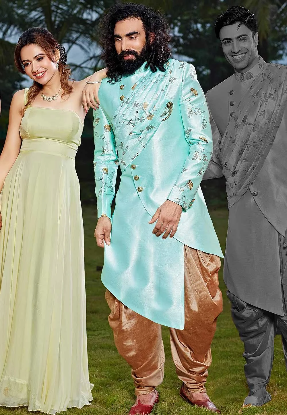 Add subtle glamour to the robust personality in this Turquoise Colour Silk Fabric Men’s Indowestern With Matching Patiala Pajama.