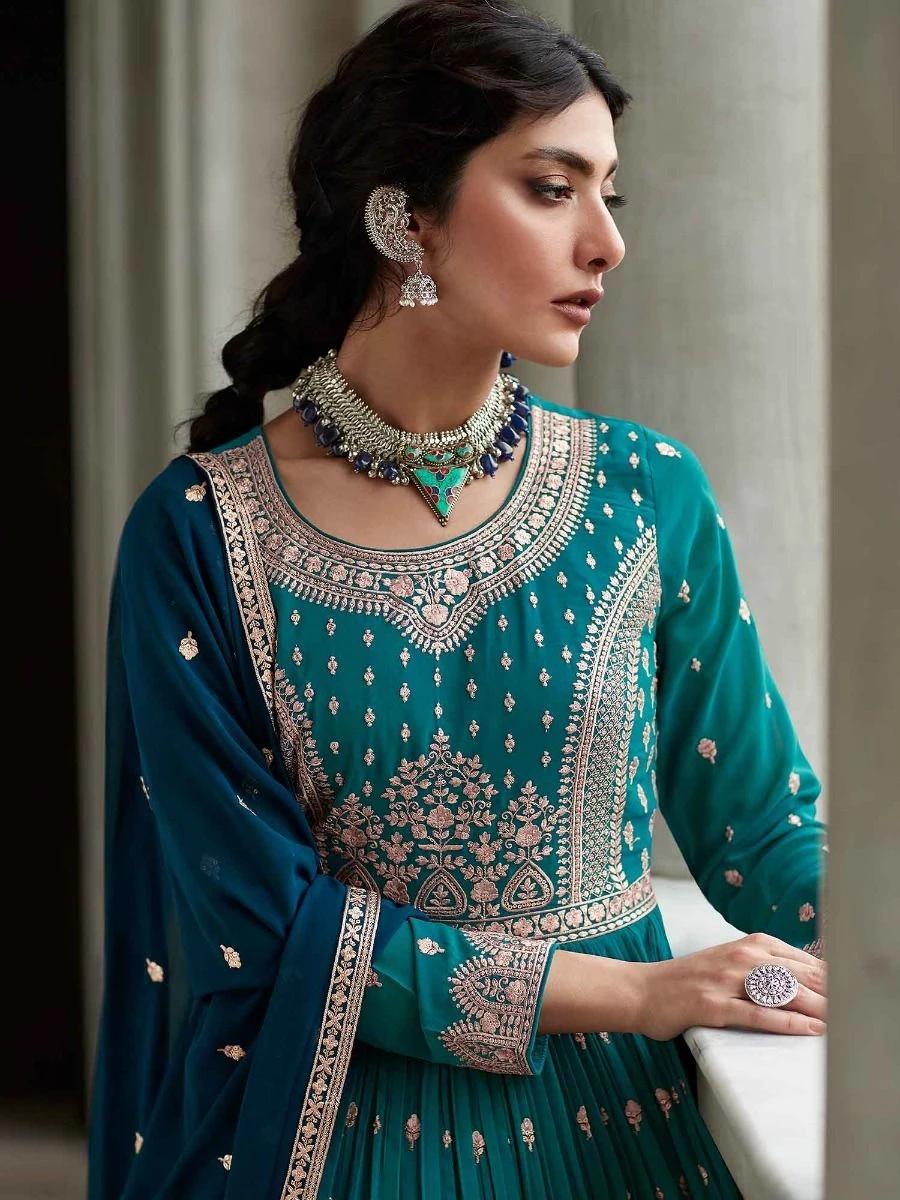Be the centre of attraction as you wear this turquoise hued kurti in georgette. Furnished with sequins and thread embroidered work. Comes with contrast matching prussian blue color georgette lehenga and dupatta, both embellished in similar work. Note: The accessories featured are purely for fashion purposes. Due to photography reasons, some color variations may occur. The semi-stitched choli and lehenga waist may be customized up to 42 inches.