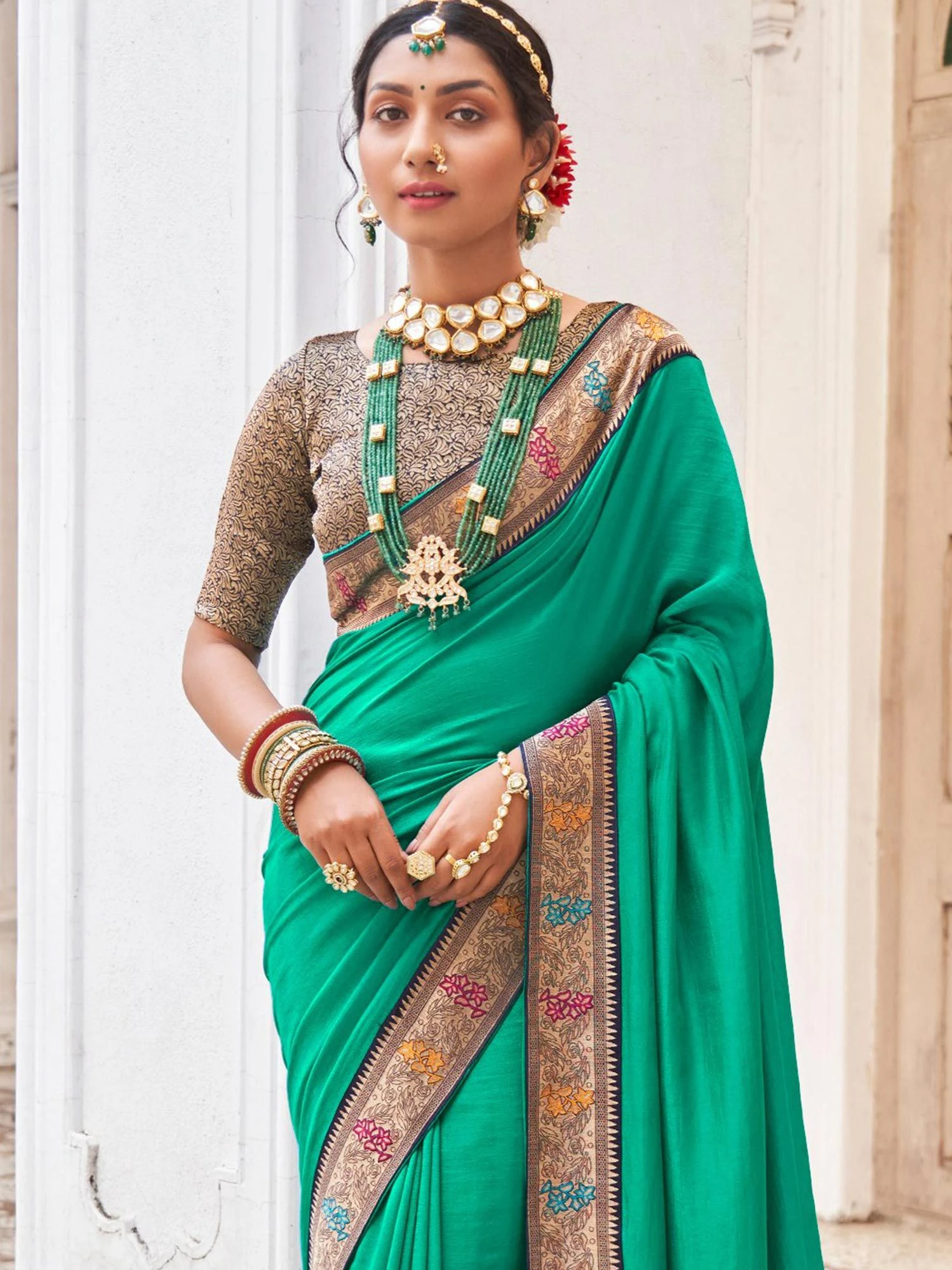 Embrace your ethnicity as you wear this turquoise color saree crafted in art silk. Decorated using thread woven patterns, showcasing distinstive borders. Assembled with a contrast matching golden woven blouse in jacquard. Note: The accessories featured are purely for fashion purposes. Due to photography reasons, some color variations may occur. The un-stitched blouse may be customized up to 42 inches.