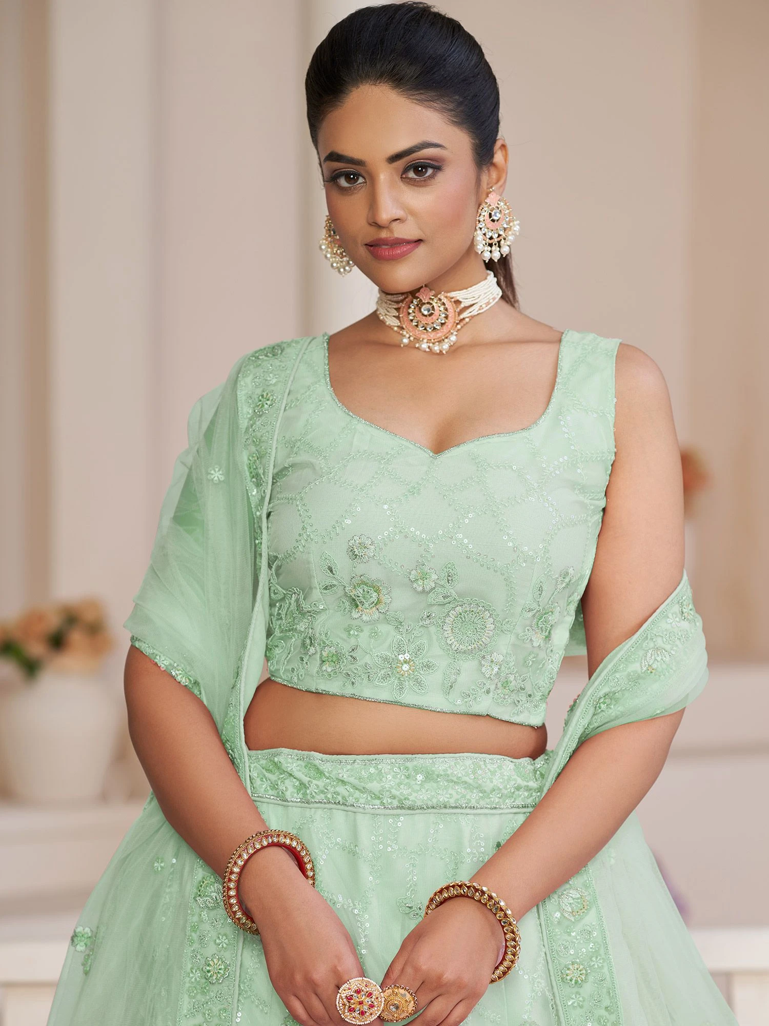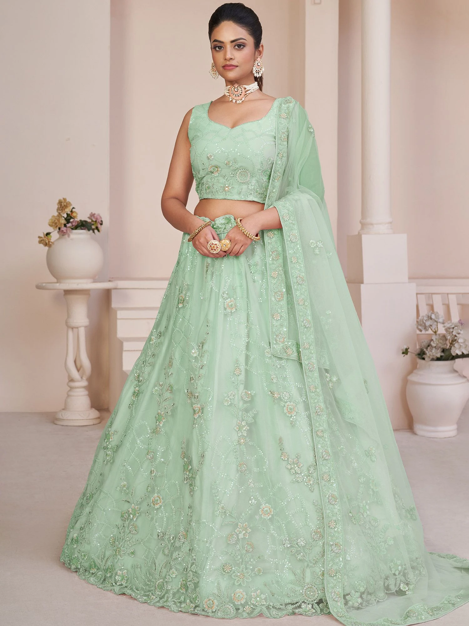 Show your feminine side to the world wearing this light turquoise color lehenga in net. Augmented with sequins, stones and floral thread embroidered. Paired with a matching color embroidered choli and a dupatta, both made in net. Note: The accessories featured are purely for fashion purposes. Due to photography reasons, some color variations may occur. The semi-stitched choli and lehenga waist may be customized up to 42 inches.