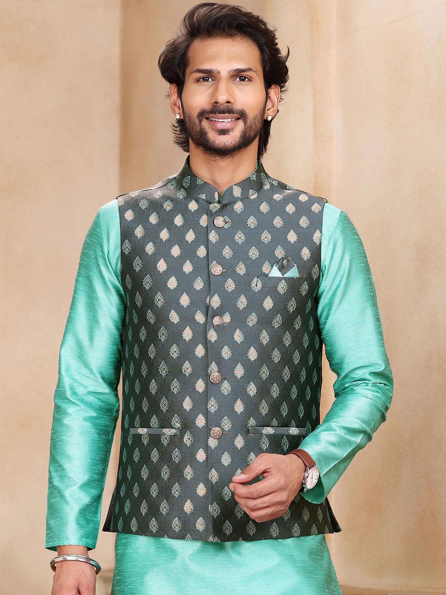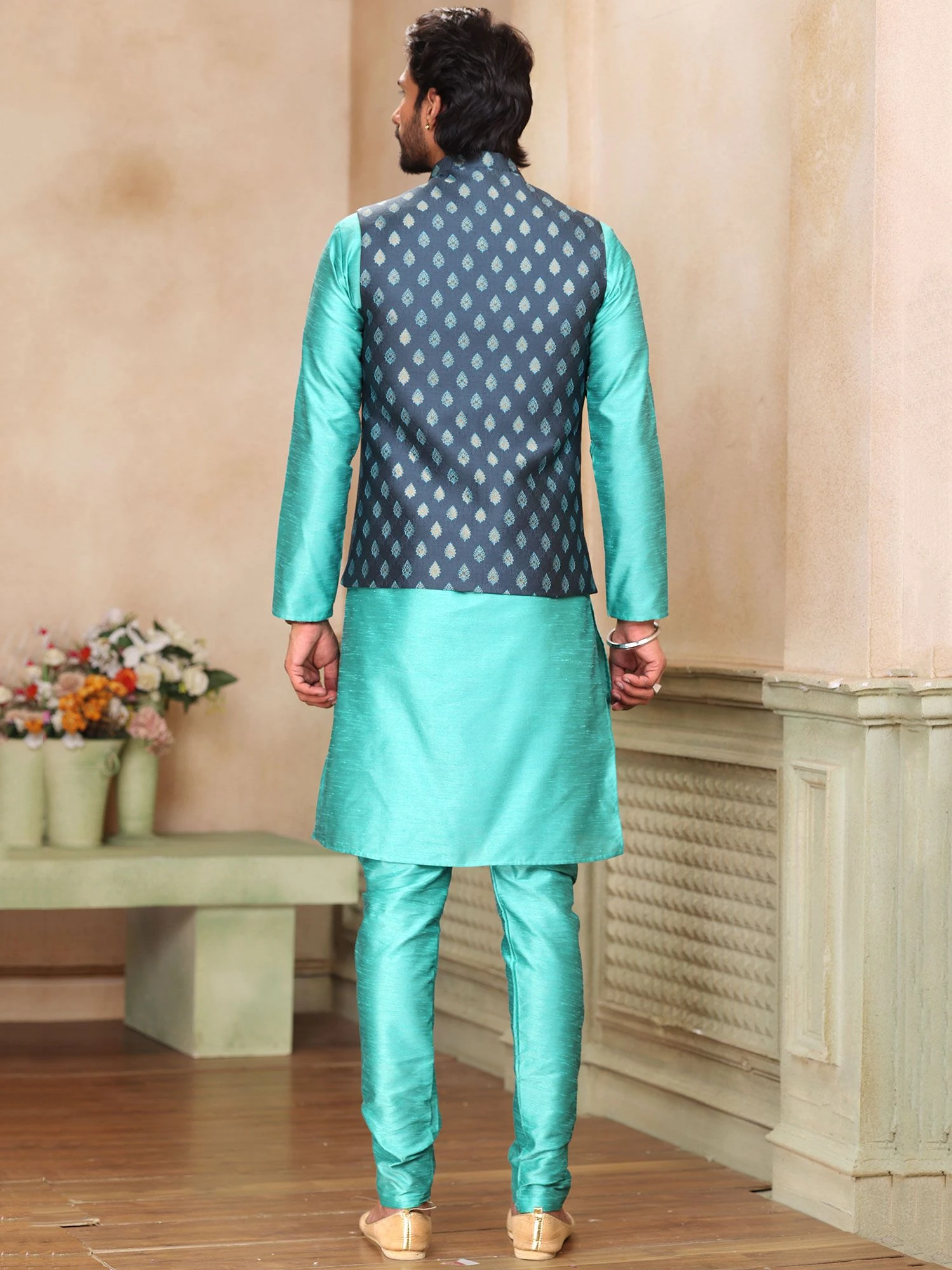 Get all the compliments as you wear this turquoise color kurta made in art silk. Topped with a dark grey color jacquard nehru jacket enriched with woven details. Assembled with a turquoise color churidaar pants in art silk. Note: Some color variations may occur owing to photography causes. Up to 1 inch of measurement fluctuation is possible.