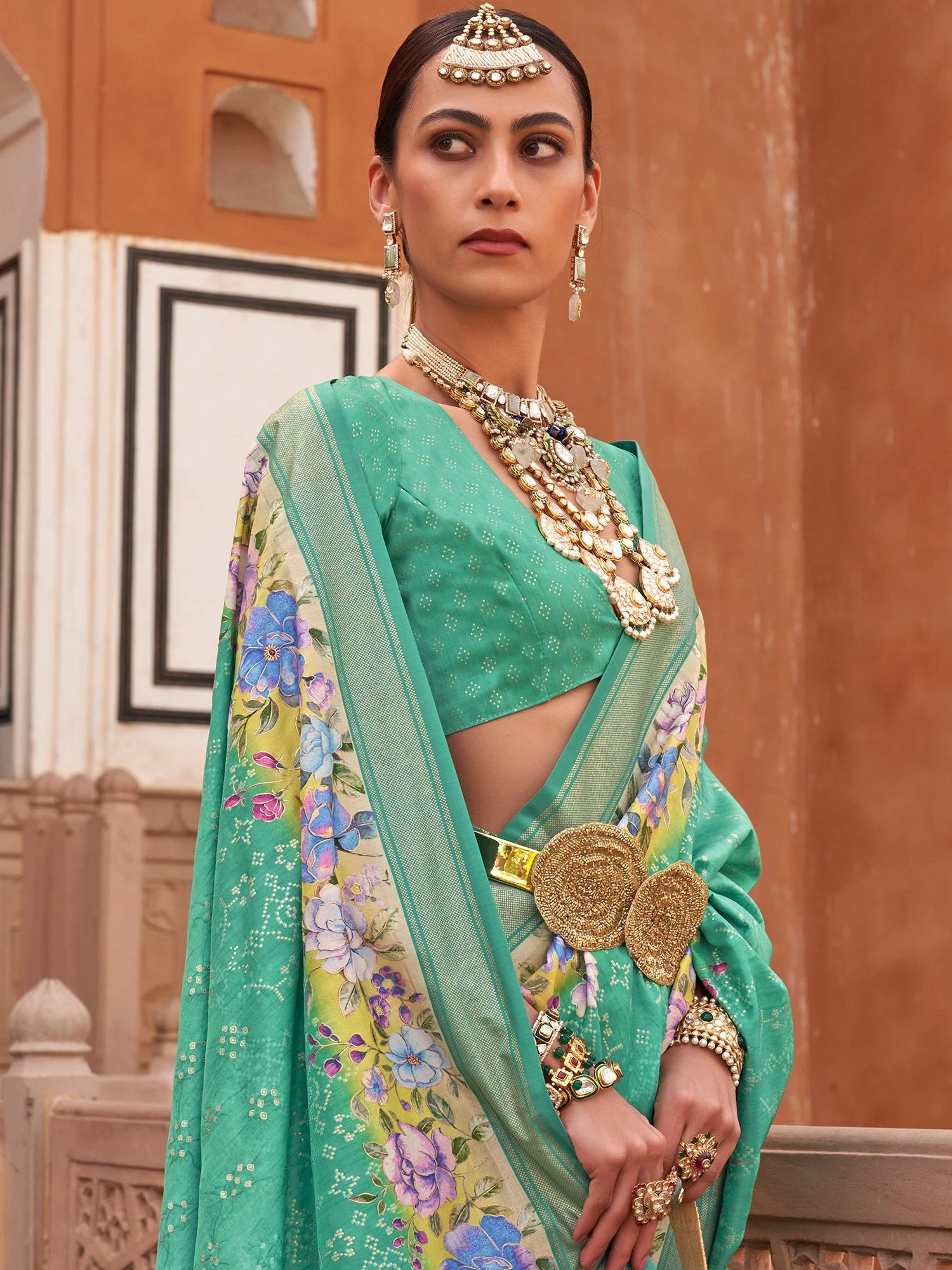 Evoke the diva in you wearing this turquoise color saree crafted in silk. Enhanced using floral printed patterns, showcasing distinstive borders and pallu. Comes with a matching turquoise color blouse in silk. Note: The accessories featured are purely for fashion purposes. Due to photography reasons, some color variations may occur. The un-stitched blouse may be customized up to 42 inches.
