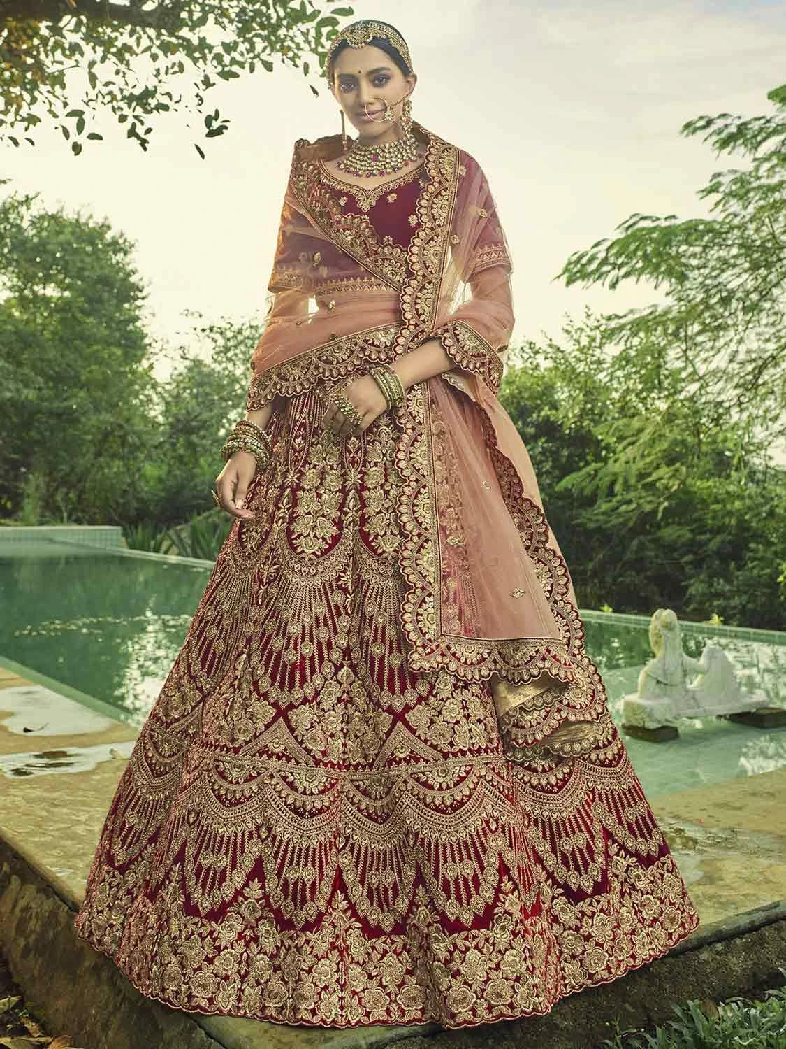 Women’s Maroon Colour Velvet Fabric Lovely A Line Lehenga Style In Wedding Look This attire is nicely made with Embroidery,Hand Work work.