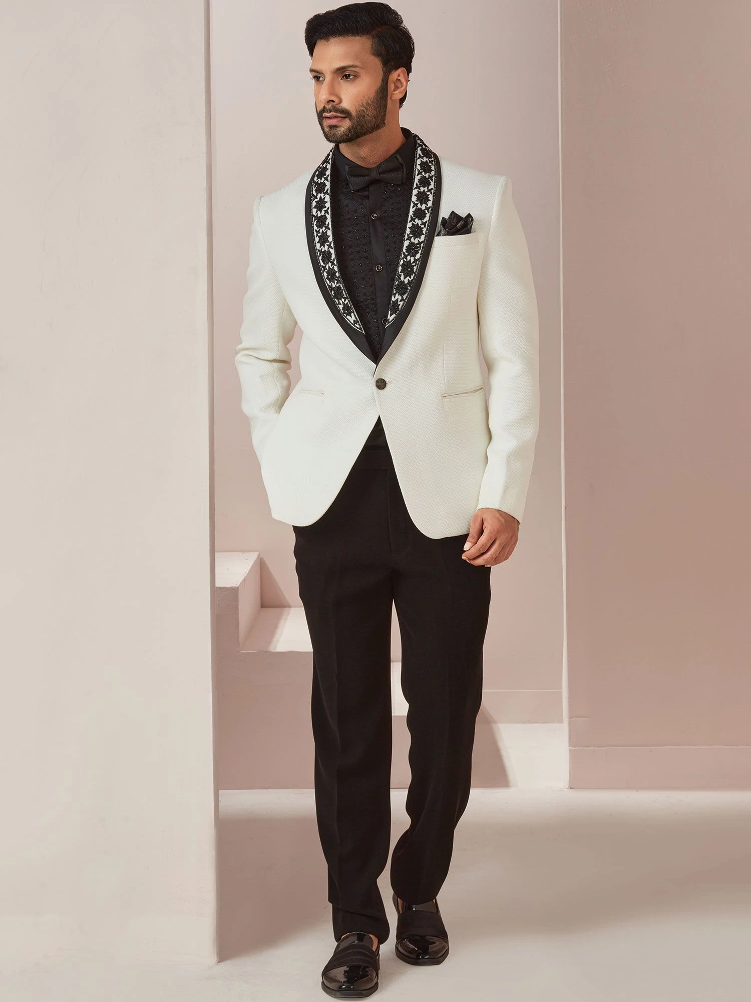 Grab all the complimemts adorning this white color tuxedo made in italian fabric. Augmented with hand embroidery work. Assembled with a black cotton shirt, bow tie and a matching black trousers. Note: Some color variations may occur owing to photography causes. Up to 1 inch of measurement fluctuation is possible.