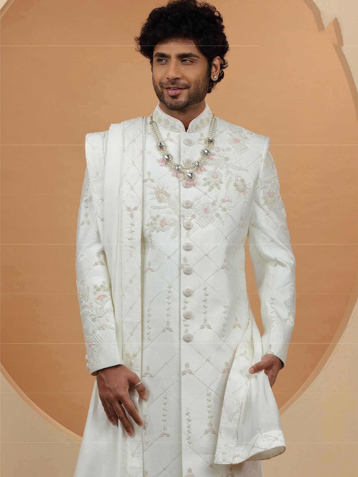 Reflect an ambiance of ethereal grace by adorning this white color sherwani made in art silk. Crafted using thread and cutdana work embroidery details all over. Comes with peach color churidaar, and an silk stole in white color. Note: Some color variations may occur owing to photography causes. Up to 1 inch of measurement fluctuation is possible.