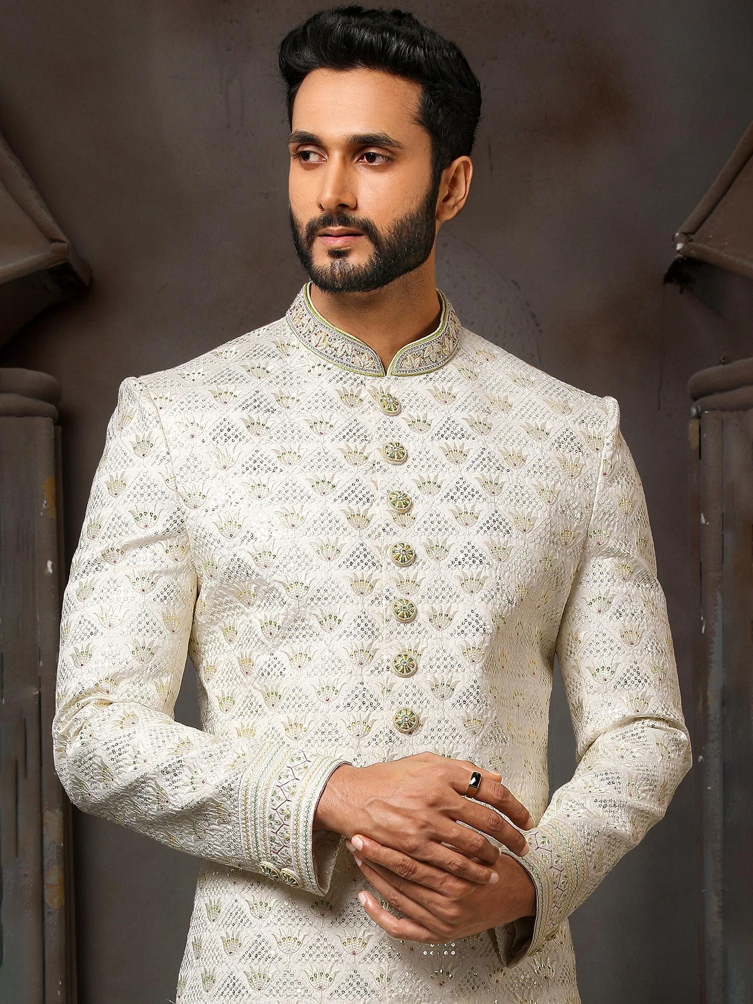 Get your hands on this white color sherwani made in art silk. Furnihsed using thread embroidery with sequins work. As shown it comes with an off-white color churidaar in dupion silk. Note: Some color variations may occur owing to photography causes. Up to 1 inch of measurement fluctuation is possible.
