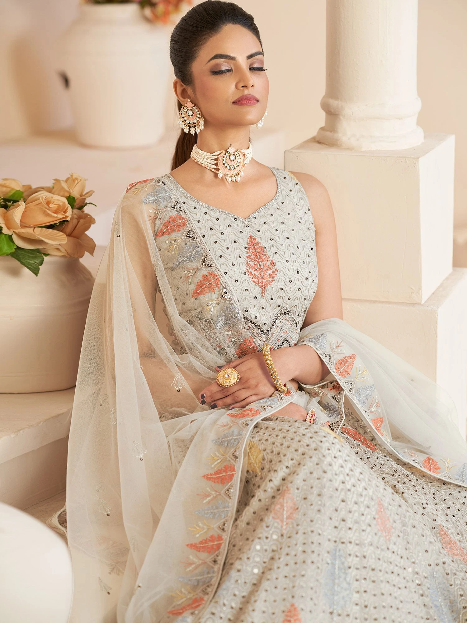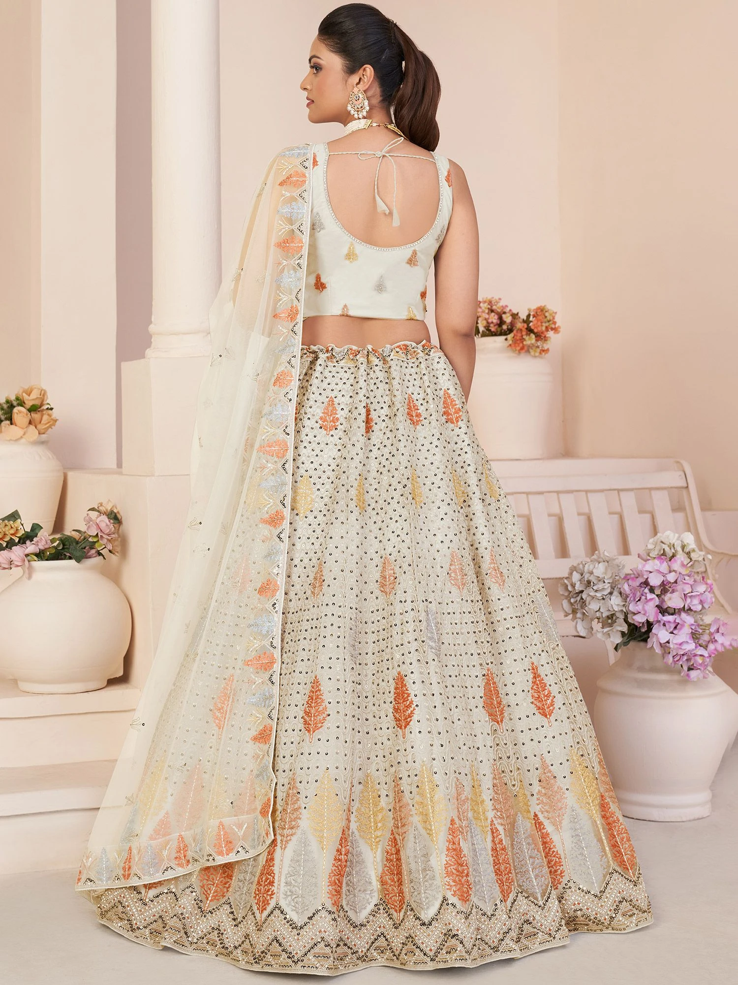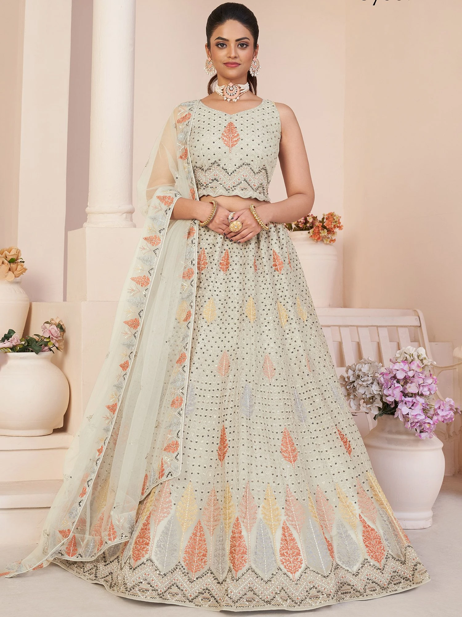 Overwhelm the audience as you wear this off-white color lehenga in net. Augmented with sequins and thread embroidered work. Paired with a matching color embroidered choli and a dupatta, both made in net. Note: The accessories featured are purely for fashion purposes. Due to photography reasons, some color variations may occur. The semi-stitched choli and lehenga waist may be customized up to 42 inches.