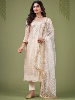 Spread the dazzling sparkles adorning this white color straight cut kameez in net. Elevated using sequins and thread work embroidery all over. Teamed with an embroidered net dupatta and matching pants in shantoon. Note: Accessories shown are for styling purpose only. Slight color variation may occur due to photographic reasons. The semi-stitched kameez can be customised upto 42 inches.