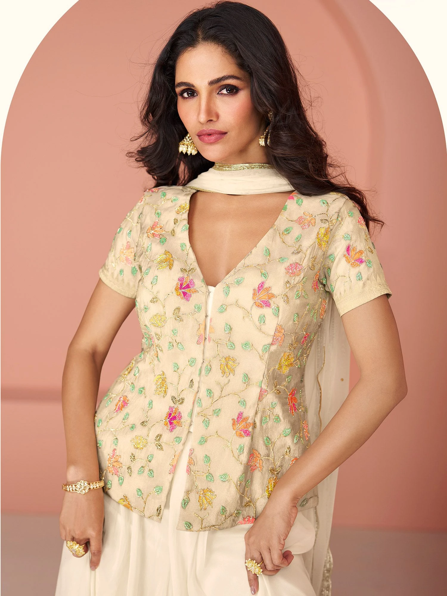 Look no less than a dream wearing this white color lehenga in georgette. Elevated with floral and thread embroidered work. Comes with a matching white color full length embroidered choli in georgette and white color dupatta, made in net. Note: The accessories featured are purely for fashion purposes. Due to photography reasons, some color variations may occur. The semi-stitched choli and lehenga waist may be customized up to 42 inches.