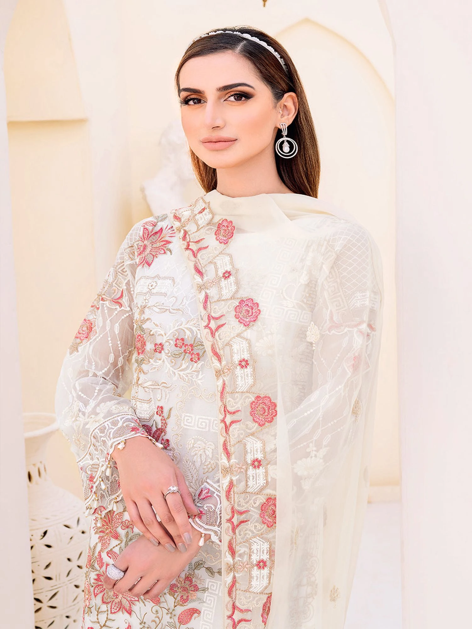 Exude major dreamy vibes with this creamy white color straight cut kameez in georgette. Designed using thread wok with floral embroidery all over. Paired with a georgette dupatta and a pant style bottom, both made in white color. Note: Accessories shown are for styling purpose only. Slight color variation may occur due to photographic reasons. The semi-stitched kameez can be customised upto 42 inches.