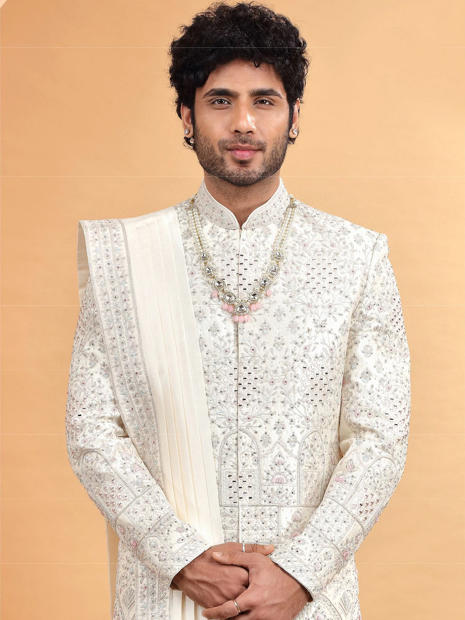 Be the best dressed diva adorning this white color sherwani made in silk. Crafted using zari work embroidery and stone embellishmest details all over. Comes with peach color churidaar, and an silk stole in white color. Note: Some color variations may occur owing to photography causes. Up to 1 inch of measurement fluctuation is possible.