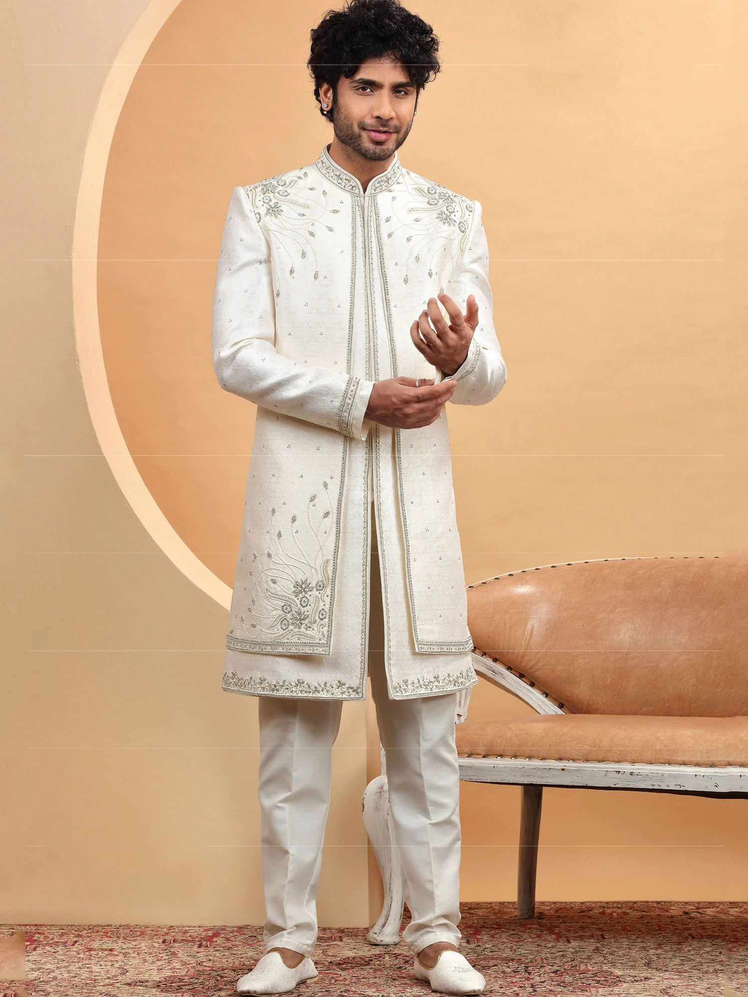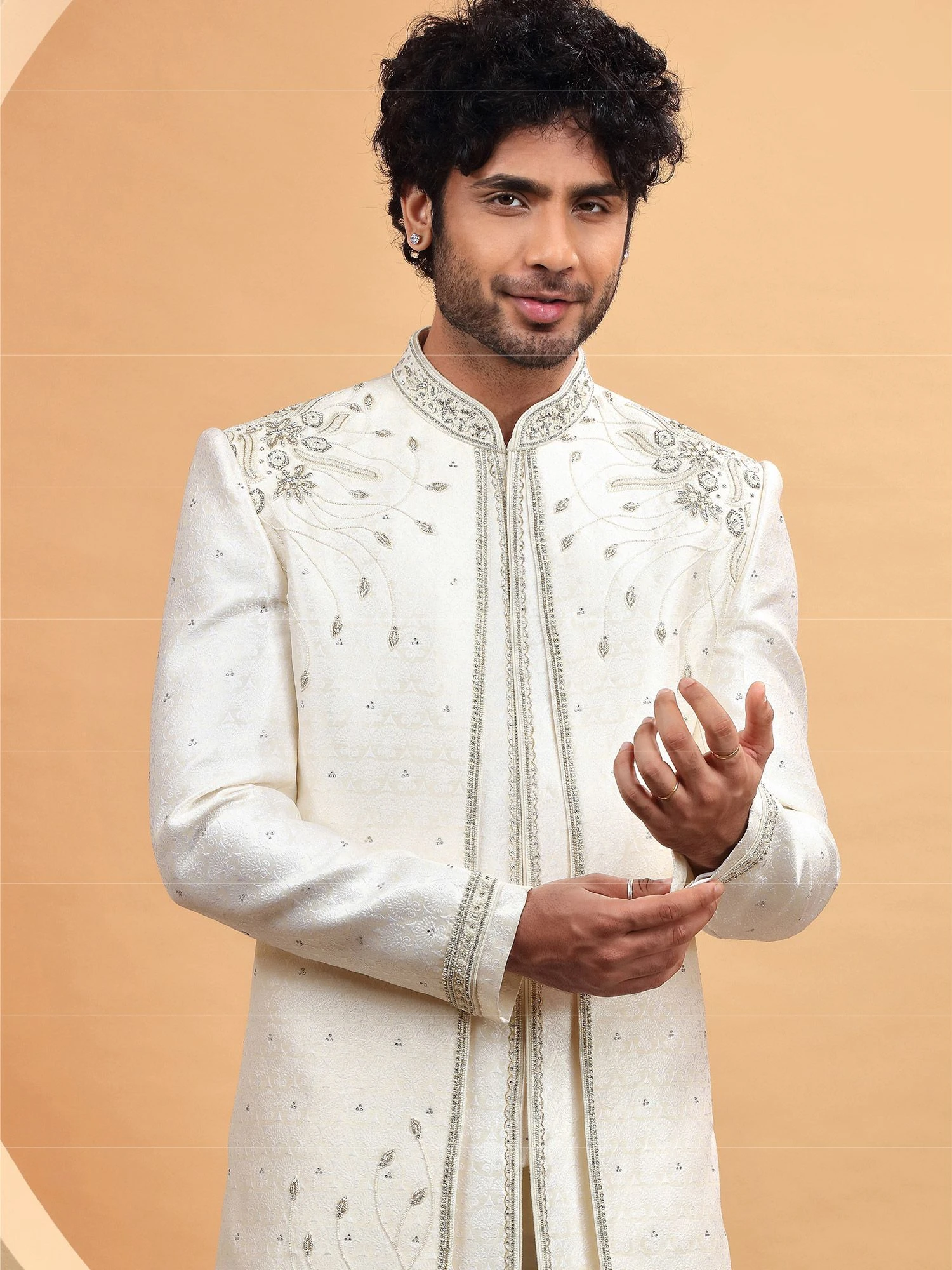 Walk the glam adorning this white color jacketed style sherwani made in jacquard. Crafted using zari work embroidery and stone embellishmest details all over. Comes with white color churidaar. Note: Some color variations may occur owing to photography causes. Up to 1 inch of measurement fluctuation is possible.