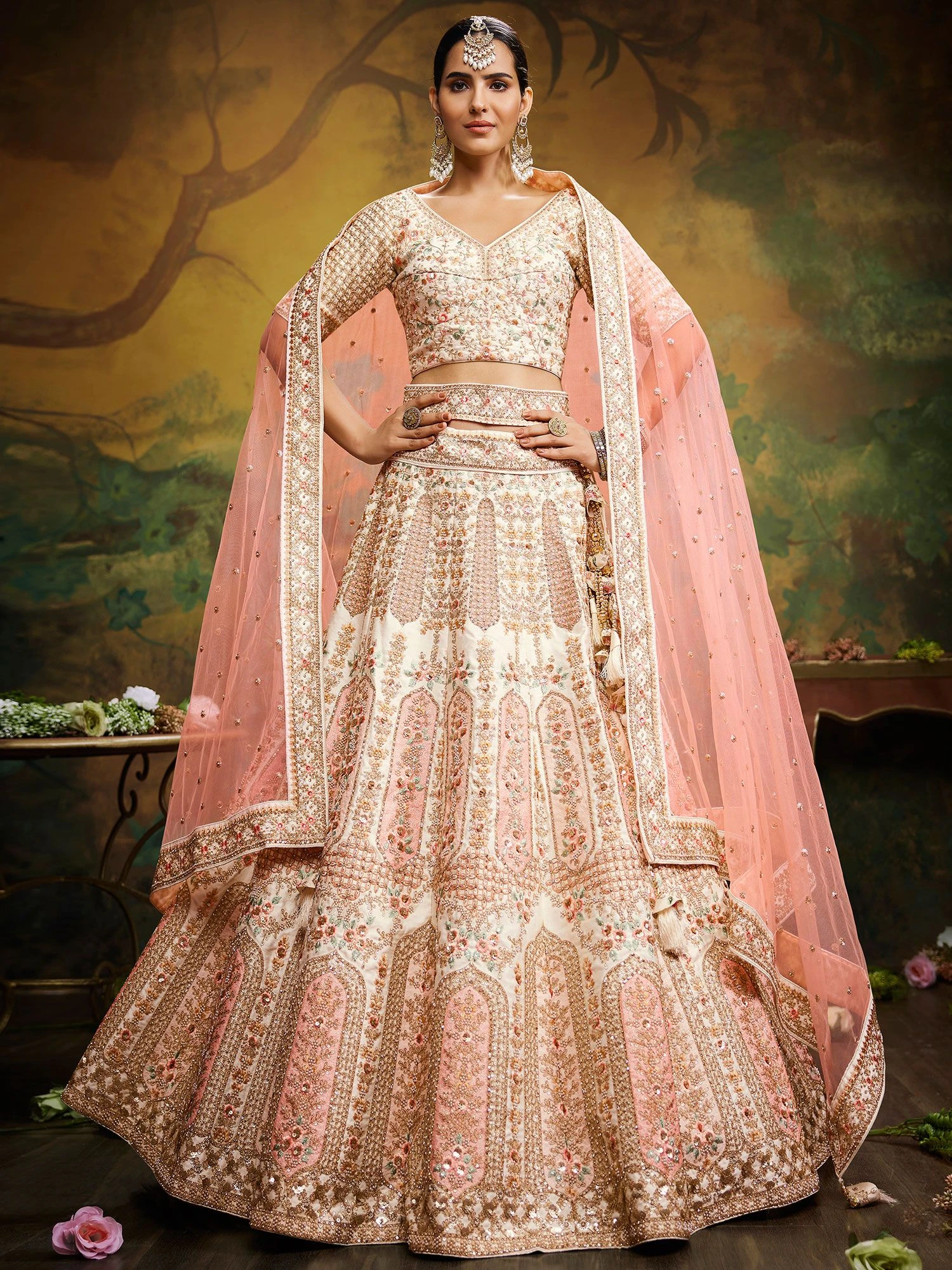 Wrap yourself in grace adorning this off-white color lehenga in silk. Designed with moti work, sequins, zari and thread embroidered work all over. Paired with a matching white color embroidered silk choli and a peach net dupatta with dense borders. Note: The accessories featured are purely for fashion purposes. Due to photography reasons, some color variations may occur. The semi-stitched choli and lehenga waist may be customized up to 42 inches.