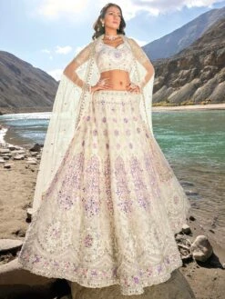 Capture the essence of femininity wearing this off white color designer lehenga in net. Elevated with sequins, stones and zari with thread embroidered work. Comes with a matching white color embroidered choli in net and white color dupatta, made in net. Note: The accessories featured are purely for fashion purposes. Due to photography reasons, some color variations may occur. The semi-stitched choli and lehenga waist may be customized up to 42 inches.