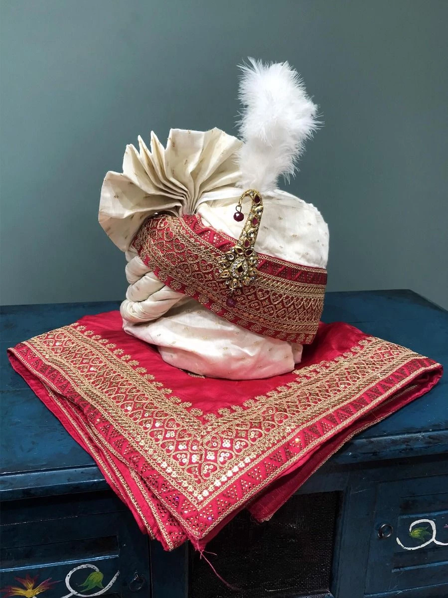 Get set to look regal adorning this white color readymade safa made in silk. Enhanced with a brooch and lace designed using stone and sequins work. Also comes with a matching embroidered pink color dupatta in silk. Note: Slight variation in color and texture may occur due to photographic reasons.