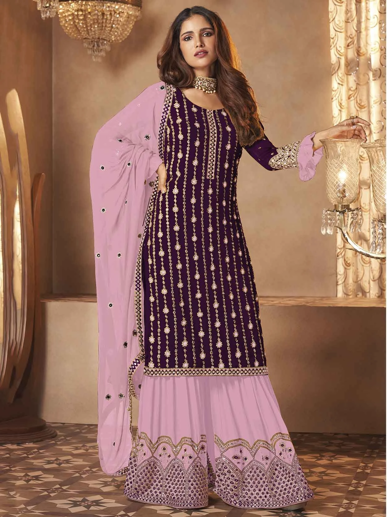 Palazzo Style Astounding Salwar Kameez in Wine Colour Georgette Fabric The lovely Zari,Thread,Mirror work a substantial attribute of this attire.