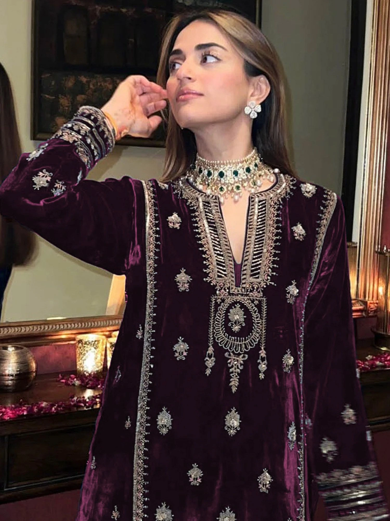 Glam up the views with this wine purple color straight cut kameez in velvet. Enhanced using sequins and zari work embroidery all over. Assigned with a velvet dupatta and a palazzo style embroiderd bottom, both made in wine purple color. Note: Accessories shown are for styling purpose only. Slight color variation may occur due to photographic reasons. The semi-stitched kameez can be customised upto 42 inches.