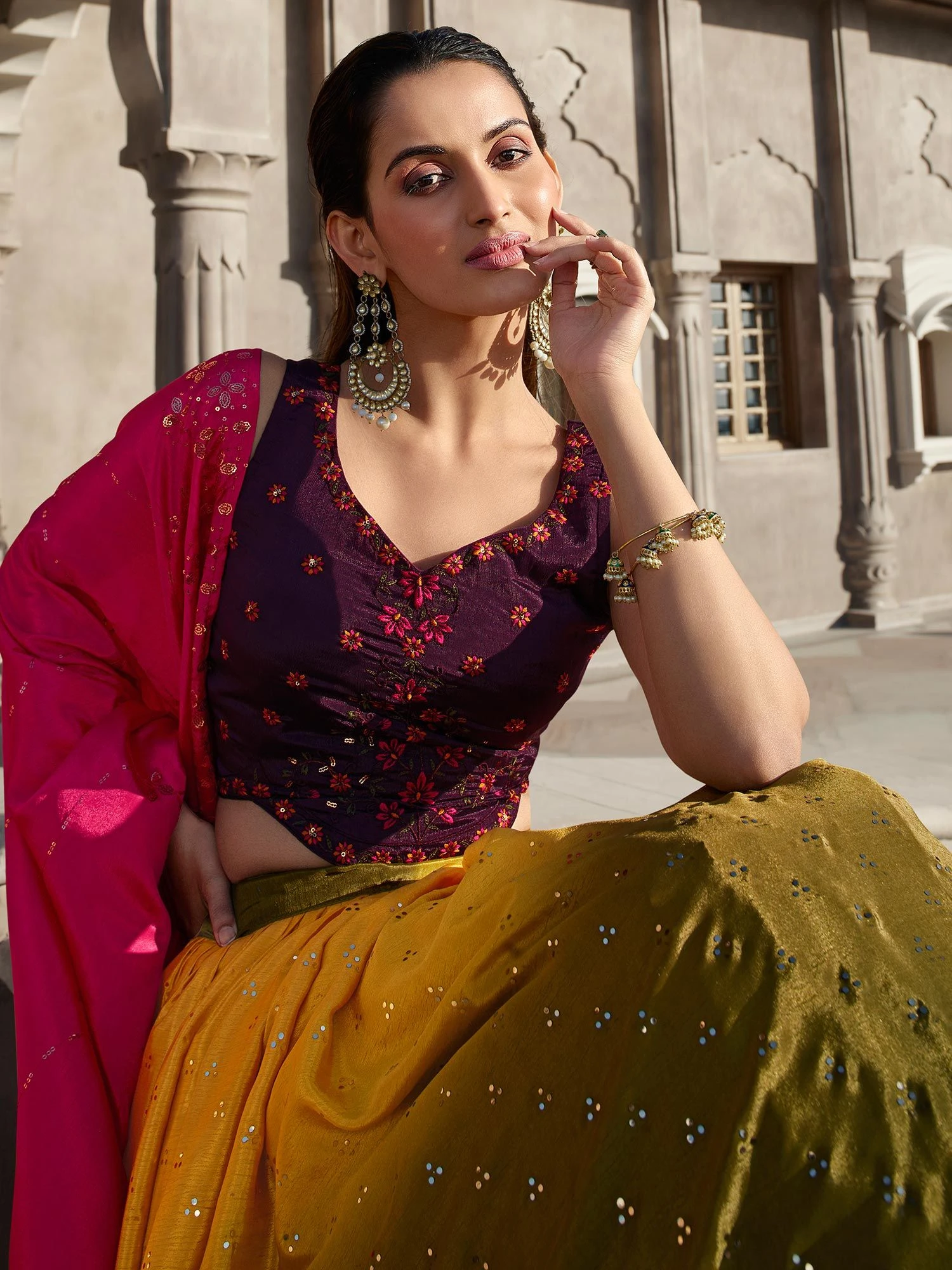 Raise the fashion bars wearing this yellow and green shaded lehenga in art silk. Decorated using sequins and thread embroidered work. Assembled with a contrast matching deep purple color embroidered choli and pink dupatta, both made in art silk. Note: The accessories featured are purely for fashion purposes. Due to photography reasons, some color variations may occur. The semi-stitched choli and lehenga waist may be customized up to 42 inches.