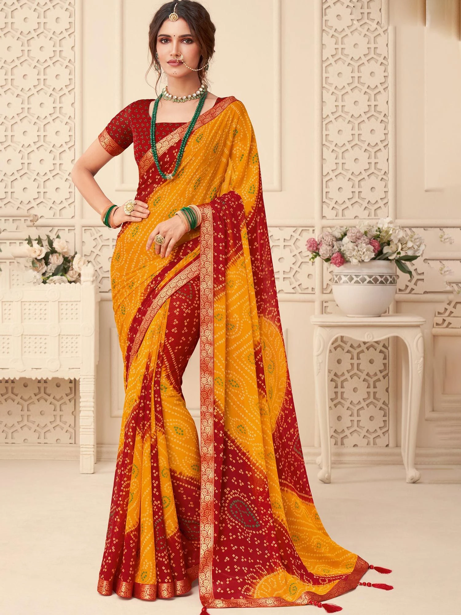 Spread cheer and festive vibes as you wear this yellow and red color saree made in chiffon. Furnished using printed bandhani patterns all over, showcasing distinstive borders. Available with a matching red color blouse in chiffon. Note: The accessories featured are purely for fashion purposes. Due to photography reasons, some color variations may occur. The un-stitched blouse may be customized up to 42 inches.