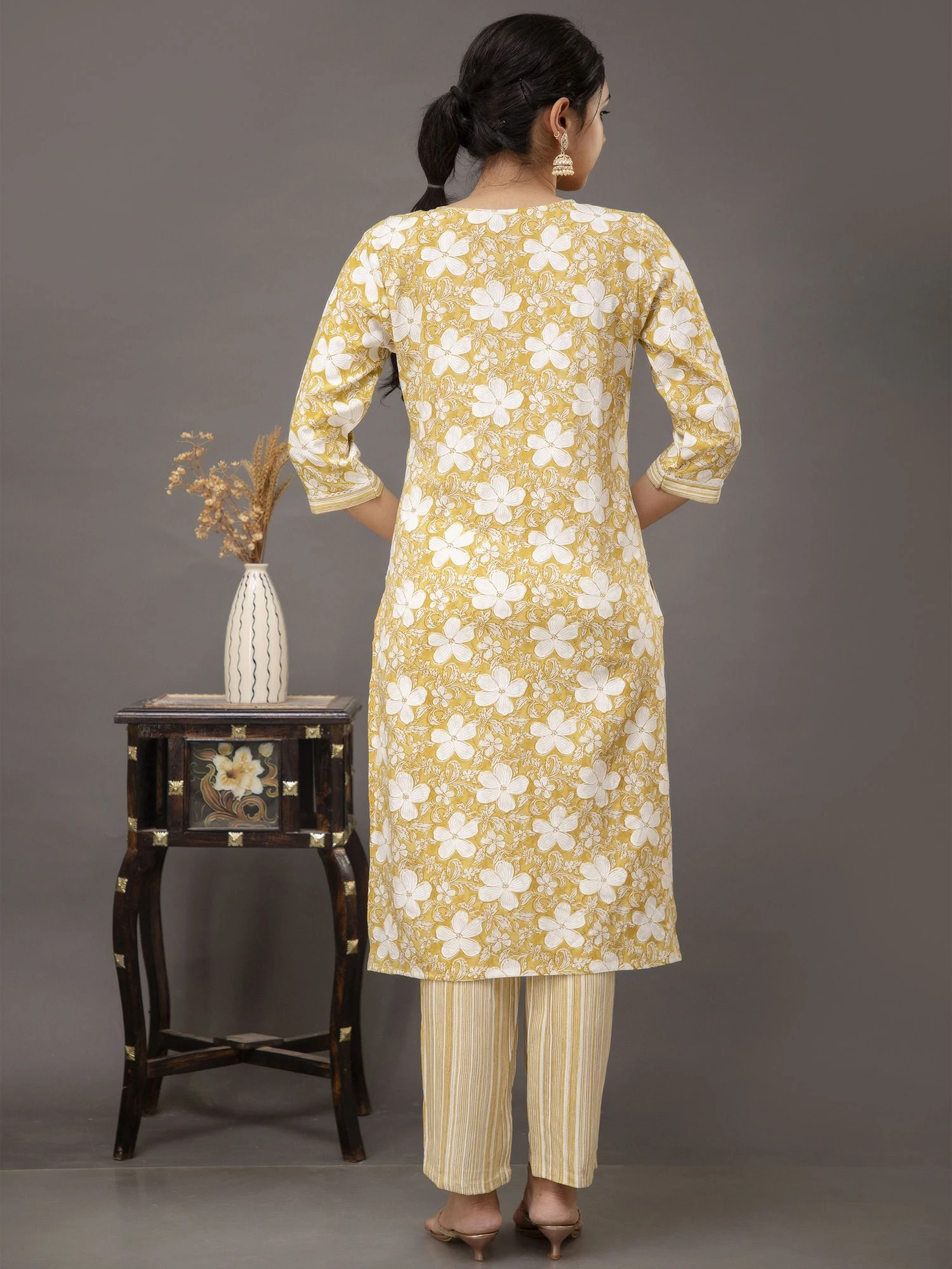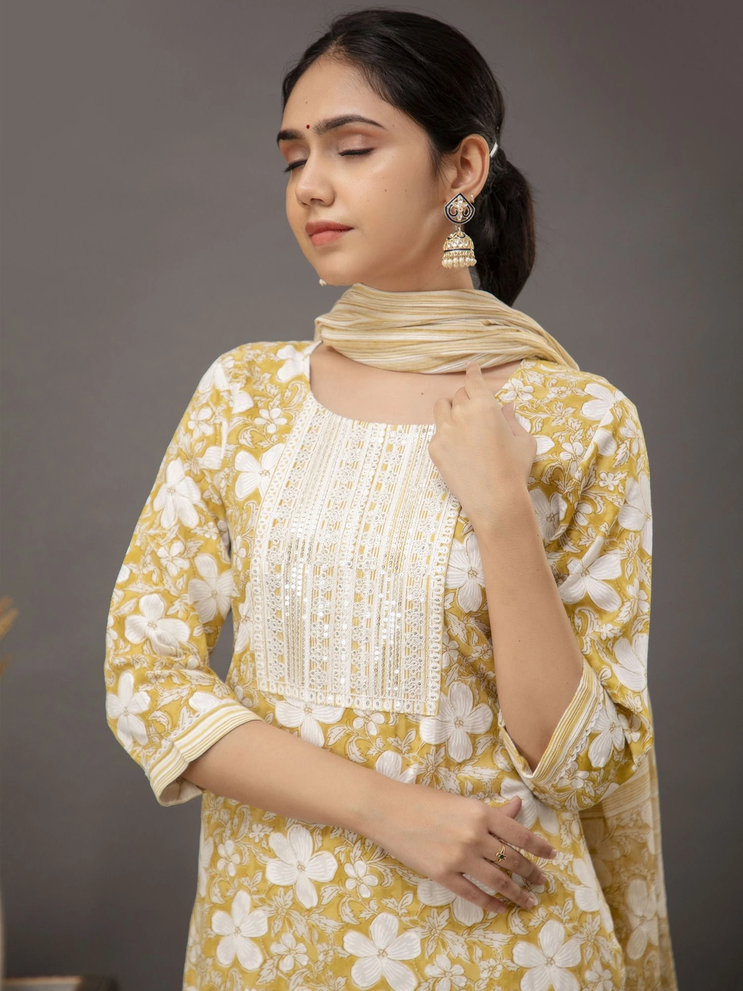 Cherish Your look with this flax yellow color straight cut kameez in cotton. Augmented using sequins and thread work and floral print all over. Assigned with a cotton dupatta and a pant style bottom, both made in yellow. Note: Accessories shown are for styling purpose only. Slight color variation may occur due to photographic reasons. The semi-stitched kameez can be customised upto 42 inches.