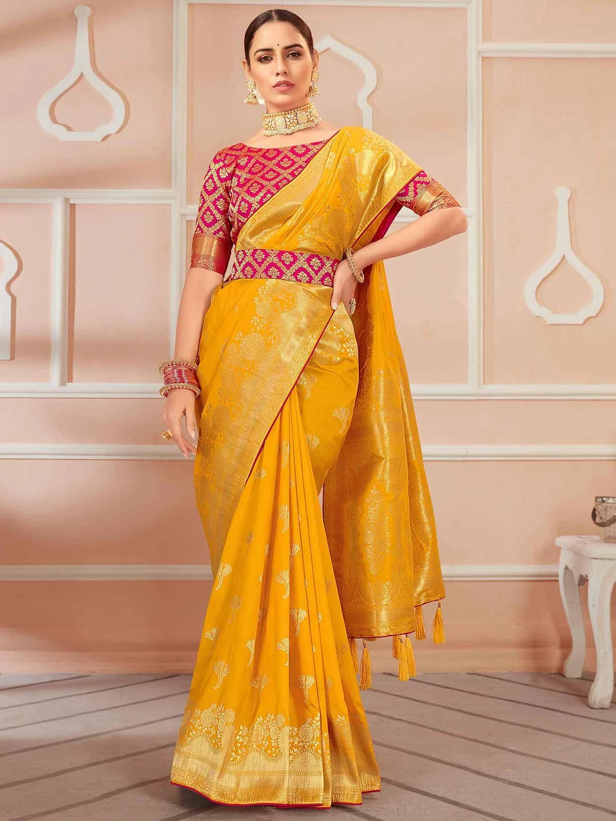 Be the sunshine of anyone’s eyes dressed in this attractive Yellow Colour Banarasi Silk Fabric Saree. The ethnic Printed,Weaving work at the clothing adds a sign of attractiveness statement with your look.