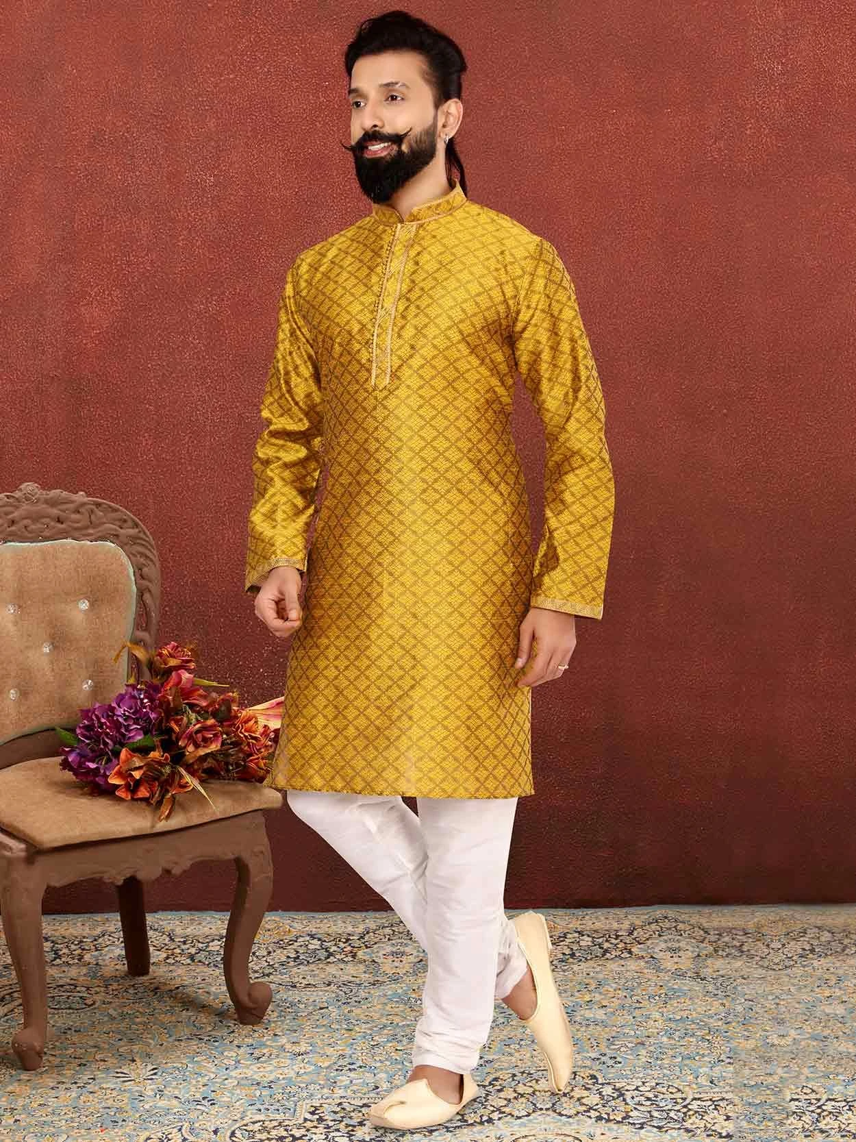 An charmingly styled Yellow Colour Jacquard,Silk Fabric Readymade Kurta Pajama that is ideal for all ethnic events.