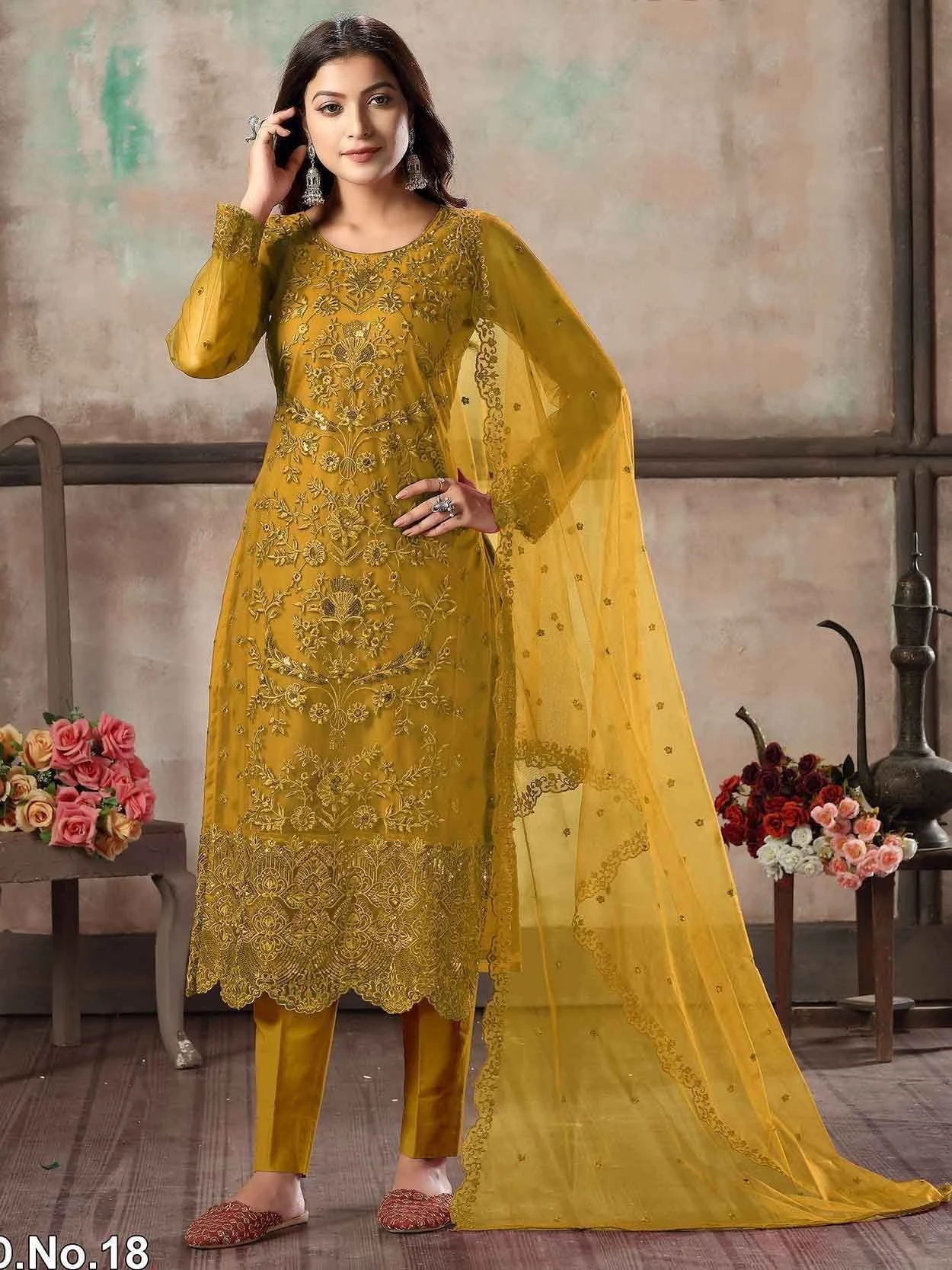Add richer looks to your persona in such a majestic Yellow Colour Net Fabric Unstitched Salwar Kameez. The lovely Embroidery Work work a substantial attribute of this attire.