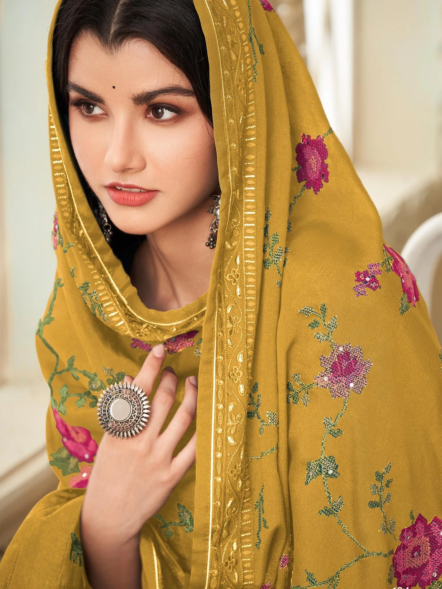Look all classy adorning this mustard yellow color straight cut kameez in crepe. Designed using sequins and thread work embroidery all over. Assembled with a matching embroidered dupatta in crepe and a matching pant in shantoon. Note: Accessories shown are for styling purpose only. Slight color variation may occur due to photographic reasons. The semi-stitched kameez can be customised upto 42 inches.