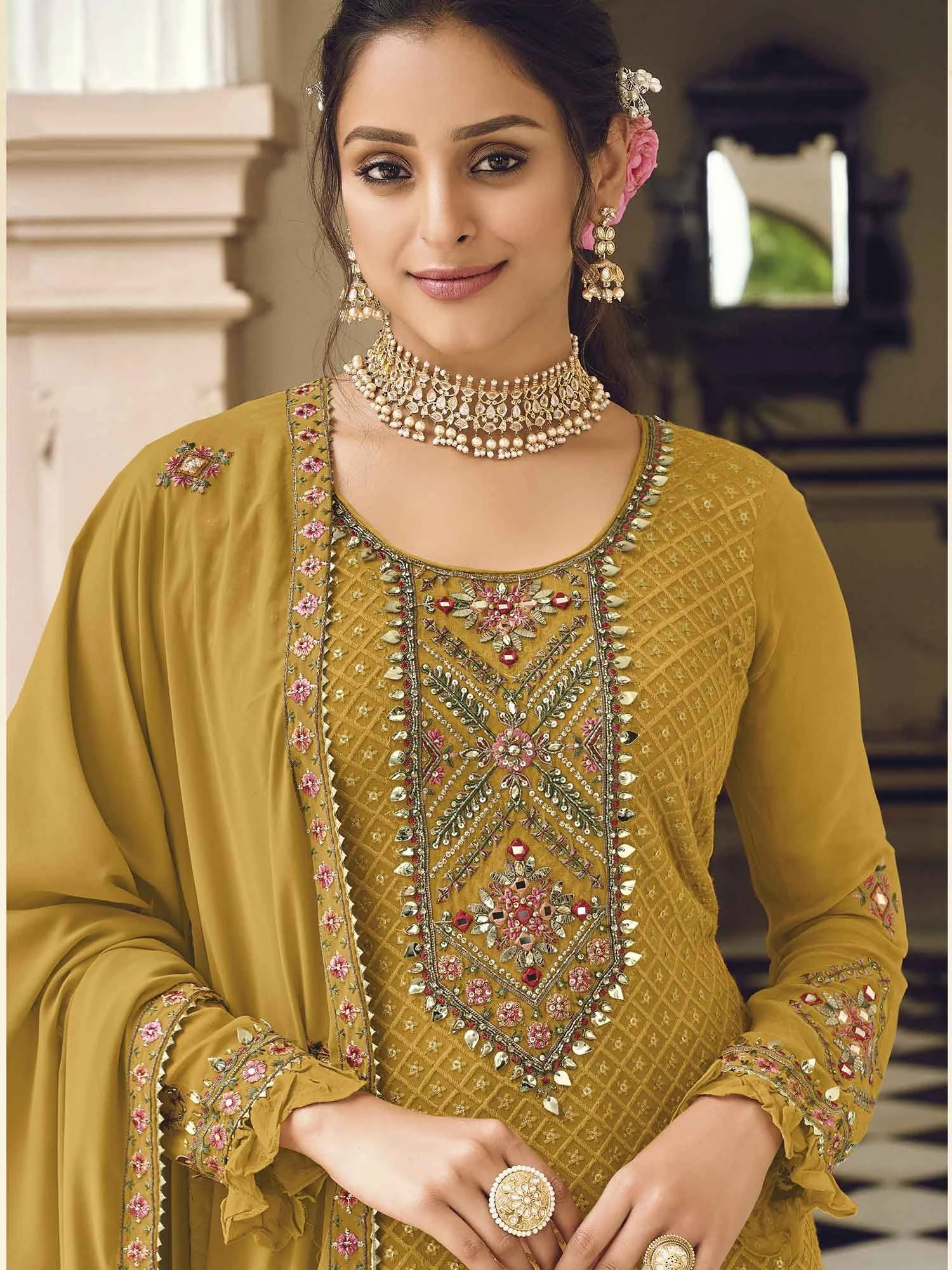 Win all hearts wearing this mustard yellow color straight cut kameez in georgette. Augmented using sequins, stones and thread embroidery all over. Teamed with a matching georgette dupatta and a matching shantoon pants. Note: Accessories shown are for styling purpose only. Slight color variation may occur due to photographic reasons. The semi-stitched kameez can be customised upto 42 inches.
