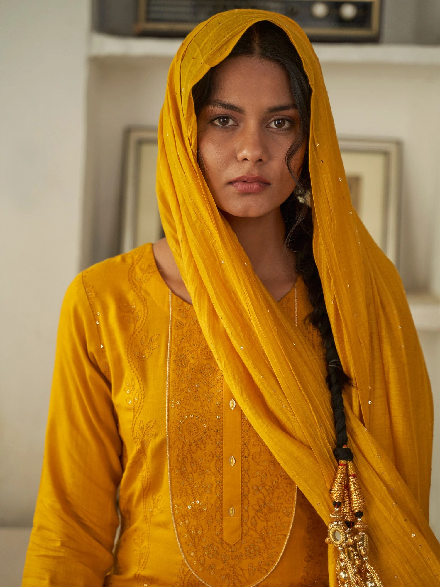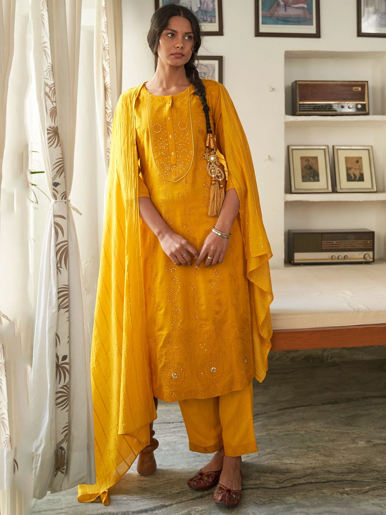 Embrace the festivities wearing this bright yellow color straight cut kameez in rayon. Elevated using sequins and thread work embroidery. Comes with a yellow embroidered dupatta in viscose and matching pants in rayon. Note: Accessories shown are for styling purpose only. Slight color variation may occur due to photographic reasons. The semi-stitched kameez can be customised upto 42 inches.