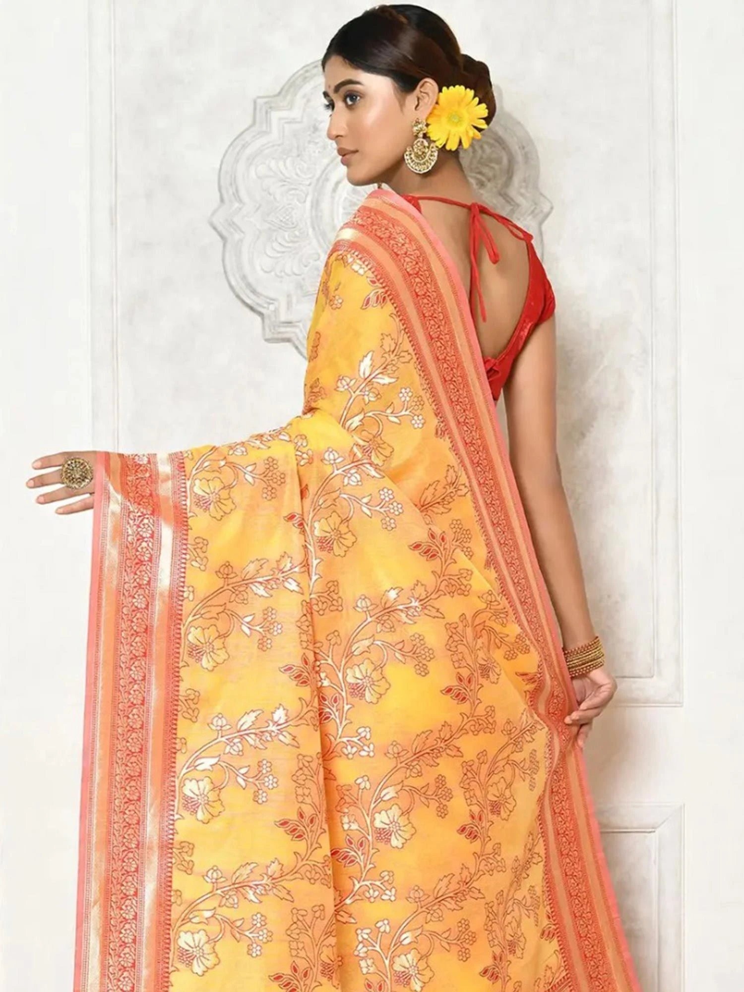 Allure the crowd wearing this bright yellow color saree crafted in cotton. Decorated using zari woven floral patterns, showcasing distinstive borders and pallu. Comes with a contrast matching red color blouse in cotton. Note: The accessories featured are purely for fashion purposes. Due to photography reasons, some color variations may occur. The un-stitched blouse may be customized up to 42 inches.