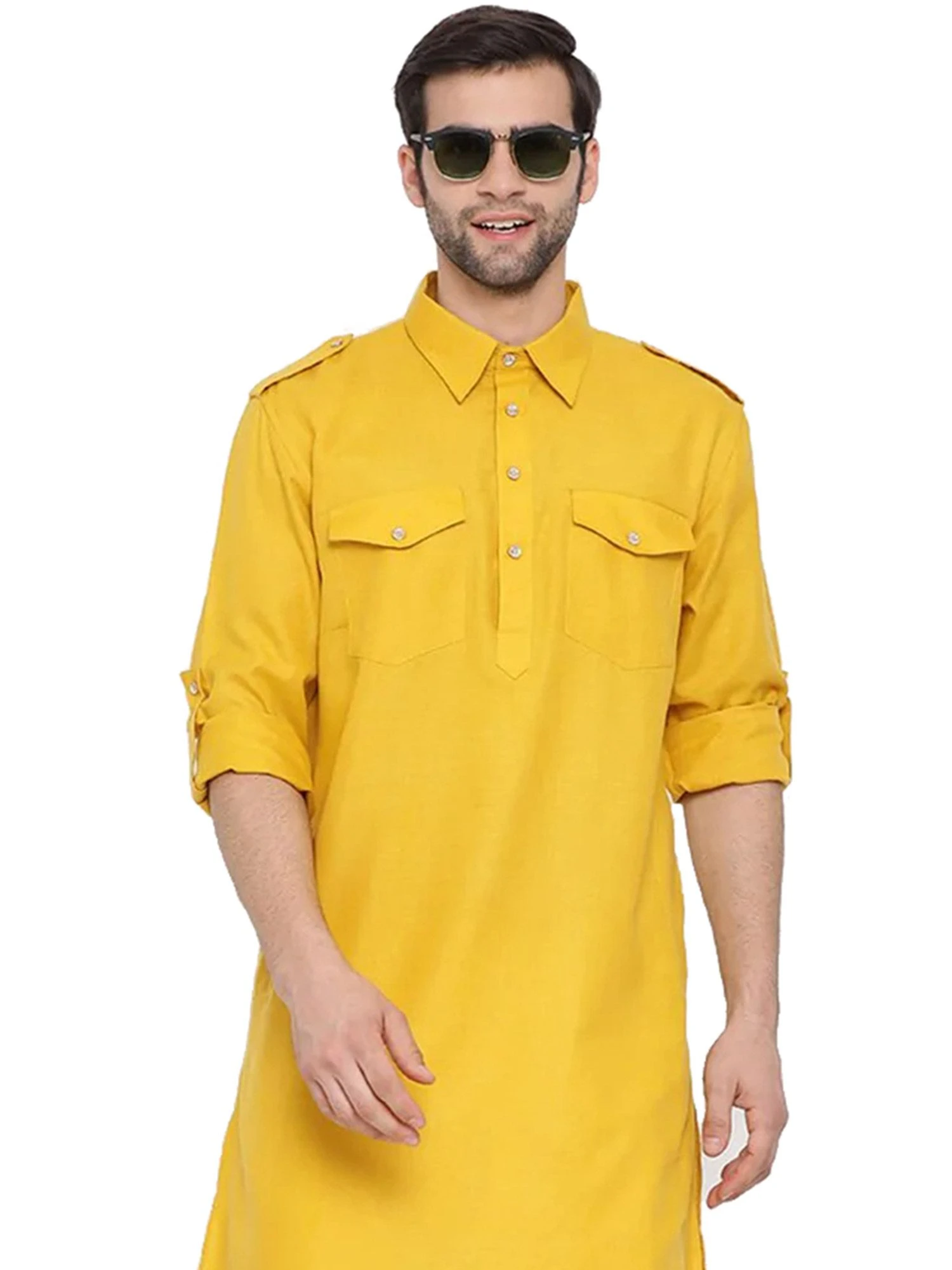 Embrace all the festive vibes adorning this bright yellow color kurta made in cotton. Furnished with coller pattern and patch pockets. Comes with a white color pathani salwar in cotton. Note: Some color variations may occur owing to photography causes. Up to 1 inch of measurement fluctuation is possible.