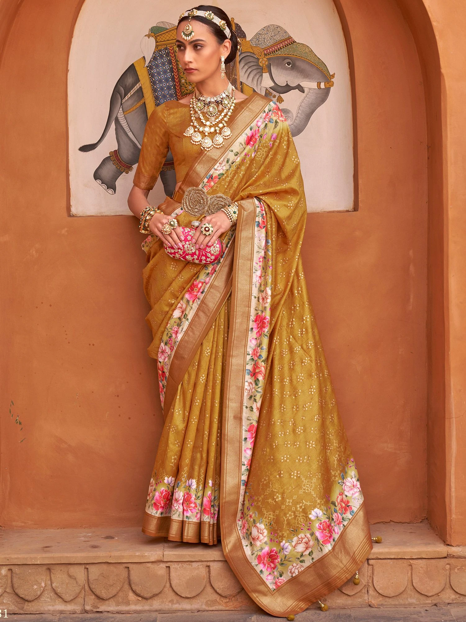 Steal the limelight adorning this honey yellow color saree fabricated in silk. Crafted using floral printed patterns, showcasing distinstive borders and pallu. Comes with a matching yellow color blouse in silk. Note: The accessories featured are purely for fashion purposes. Due to photography reasons, some color variations may occur. The un-stitched blouse may be customized up to 42 inches.